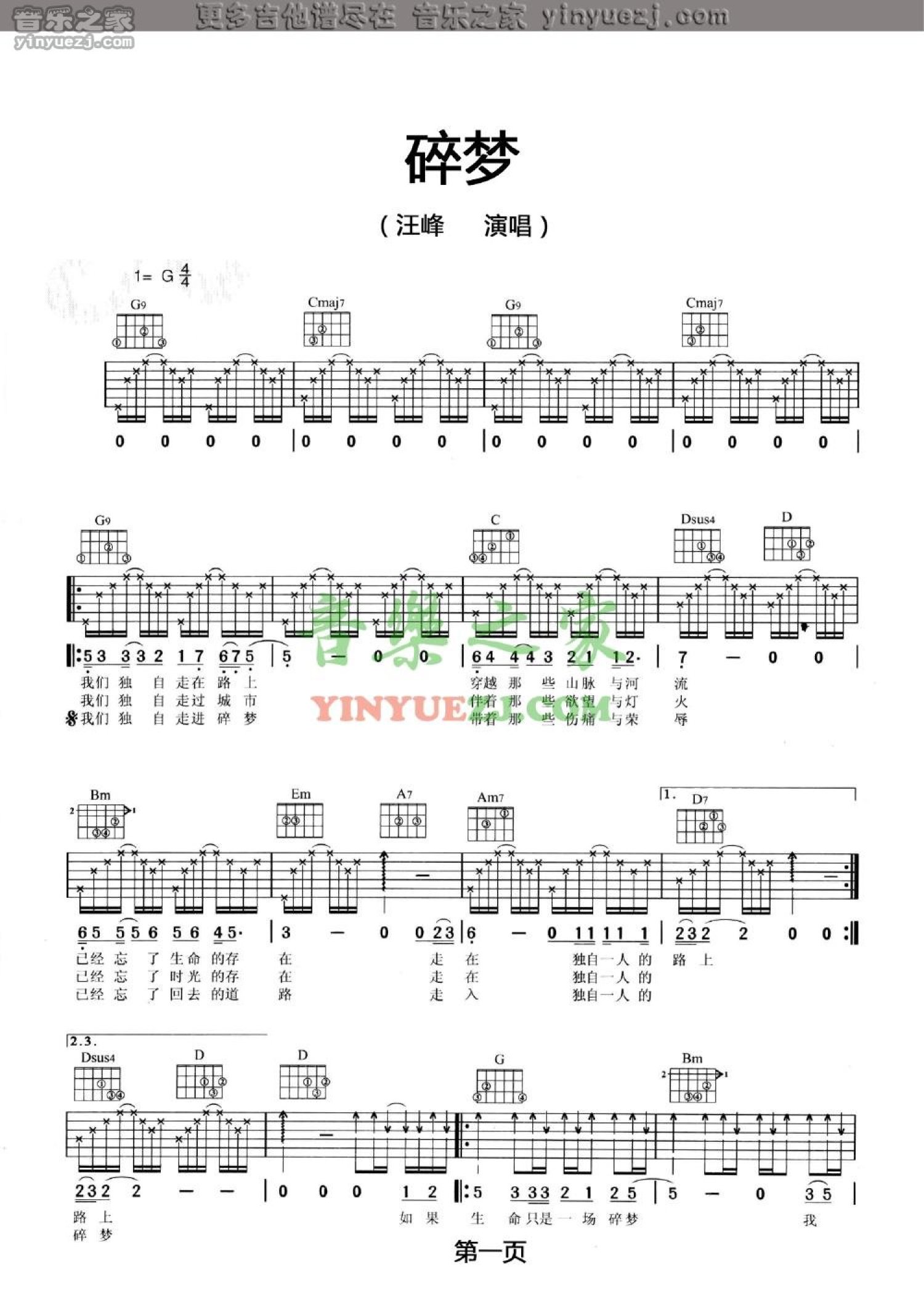 碎梦吉他谱 - 汪峰 - G调吉他弹唱谱