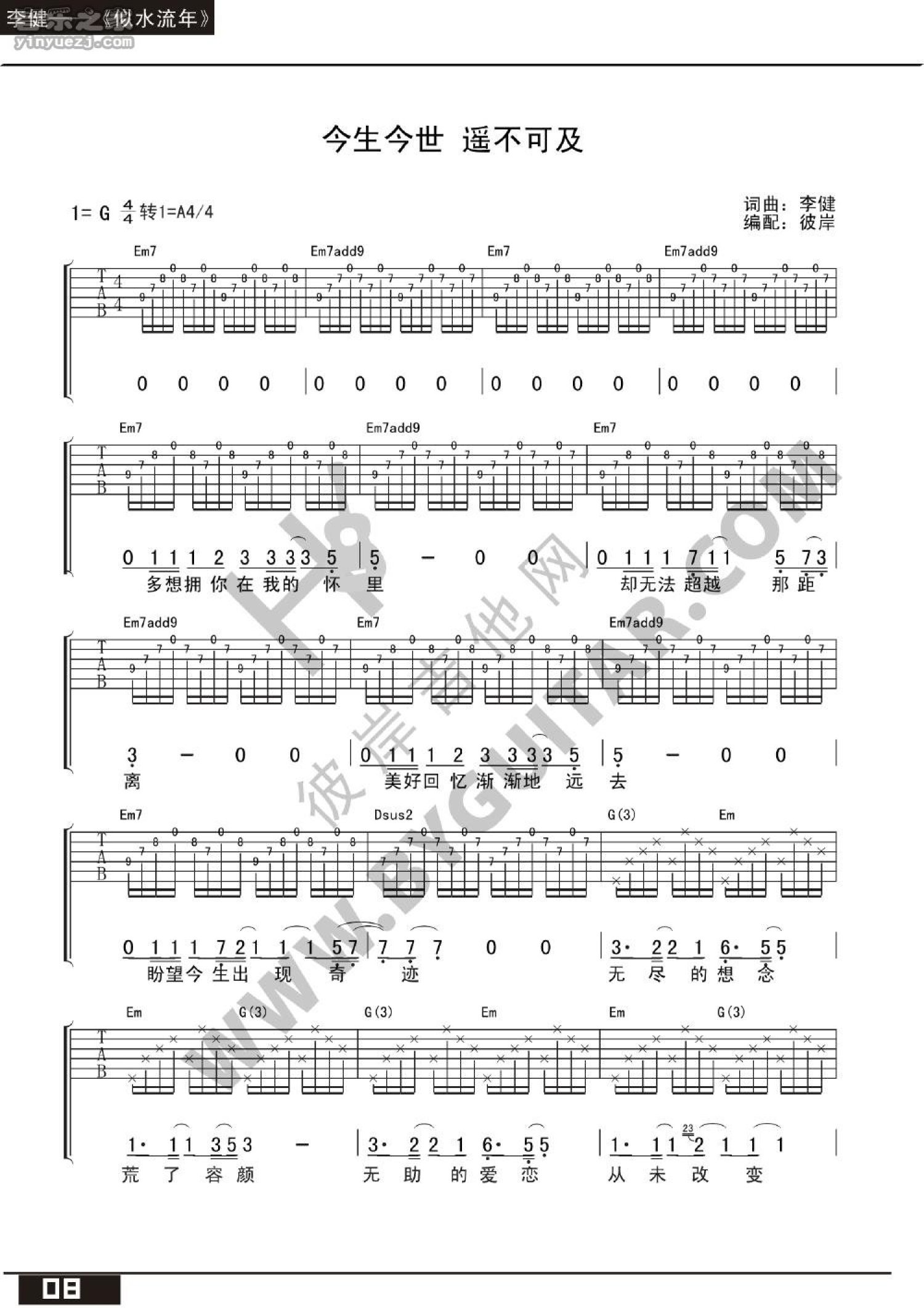 曲谱介绍: 李健《今生今世遥不可及》吉他谱