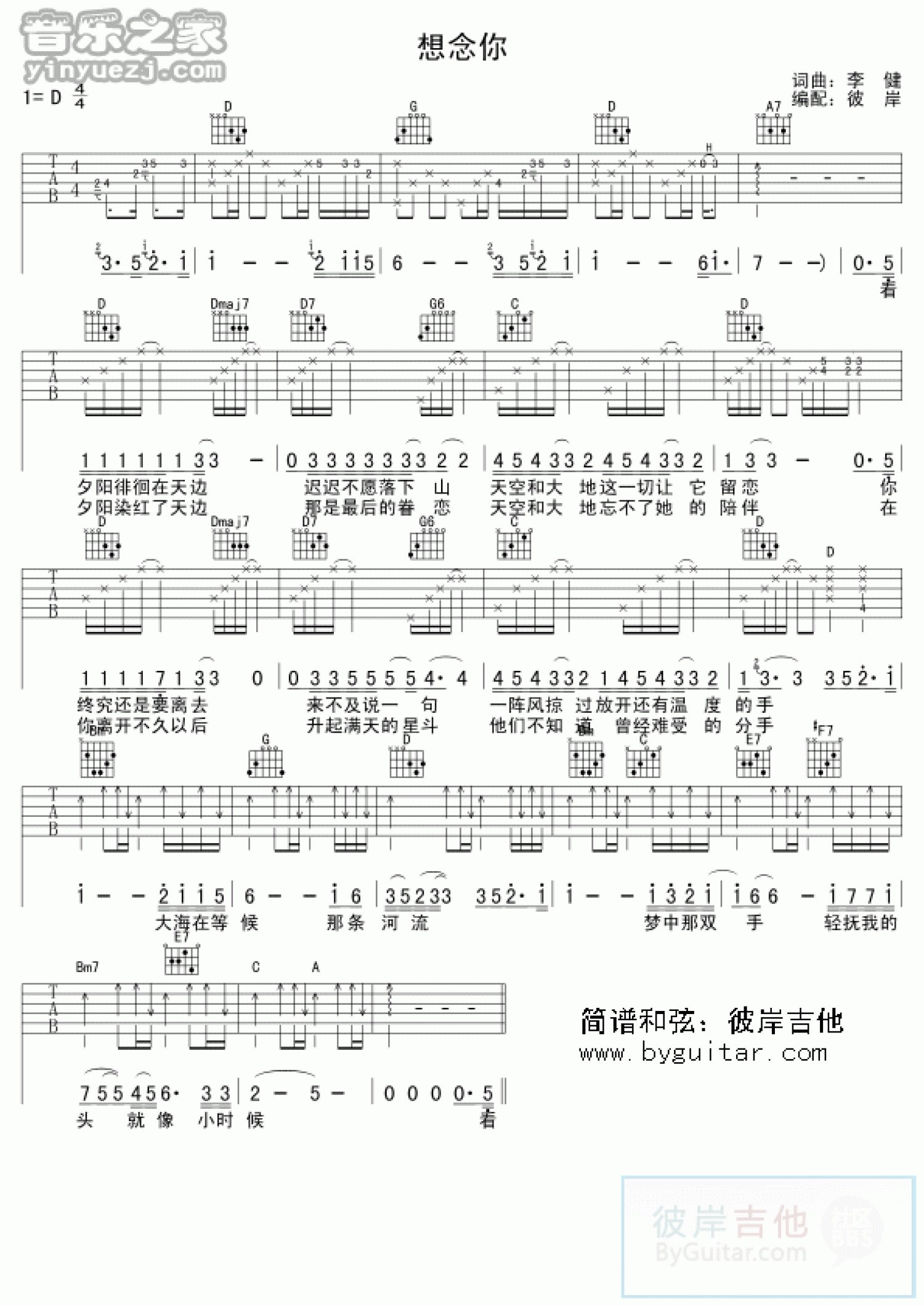 想念你吉他谱 - 李健 - D调吉他弹唱谱