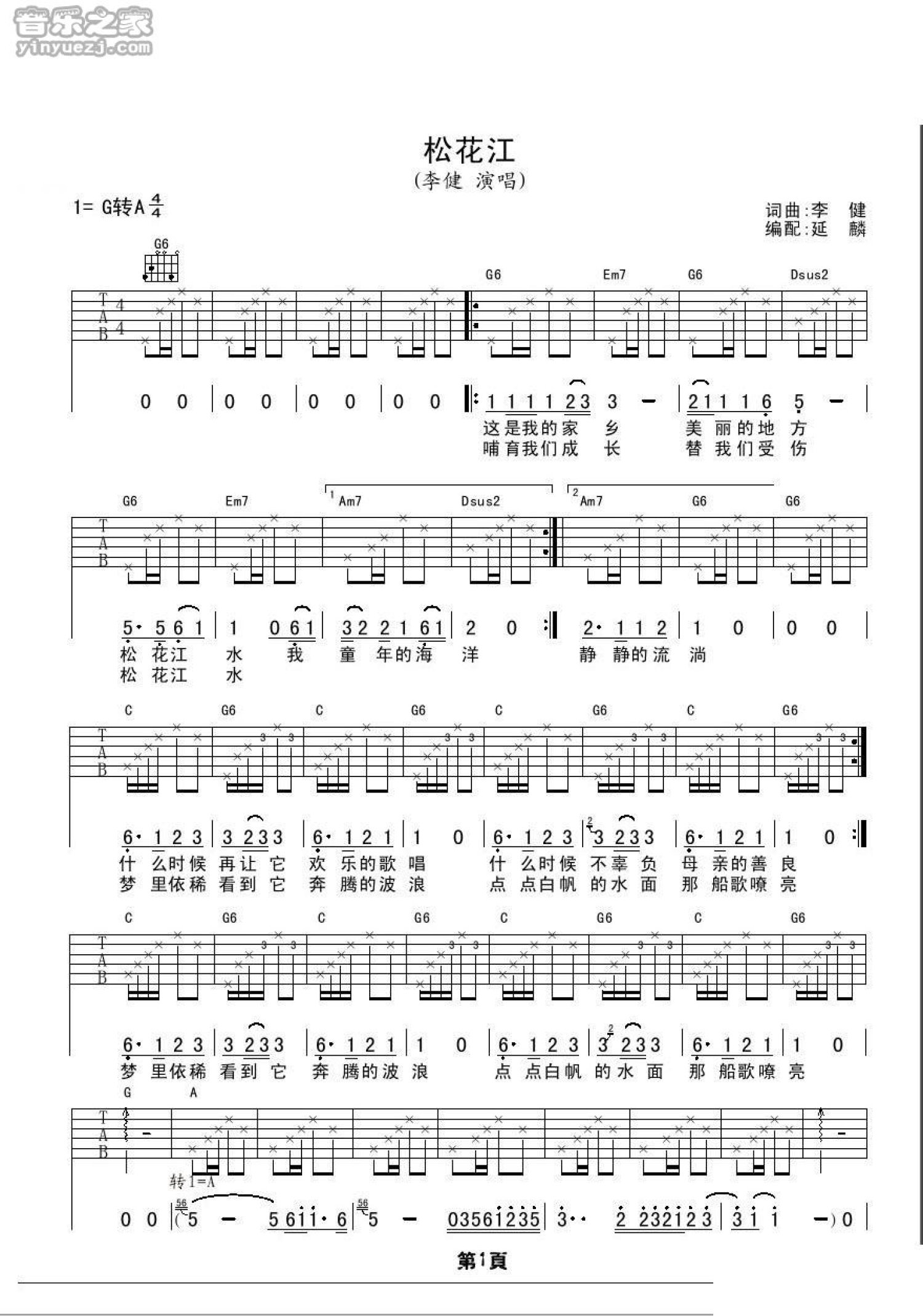 松花江吉他谱 - 李健 - G调吉他弹唱谱