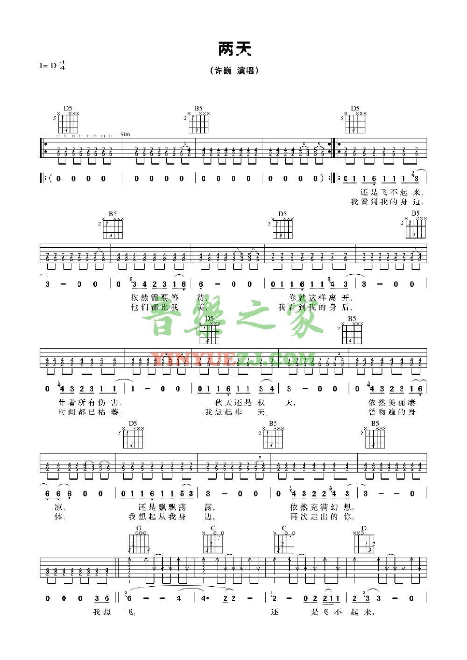 两天吉他谱 - 许巍 - D调吉他弹唱谱
