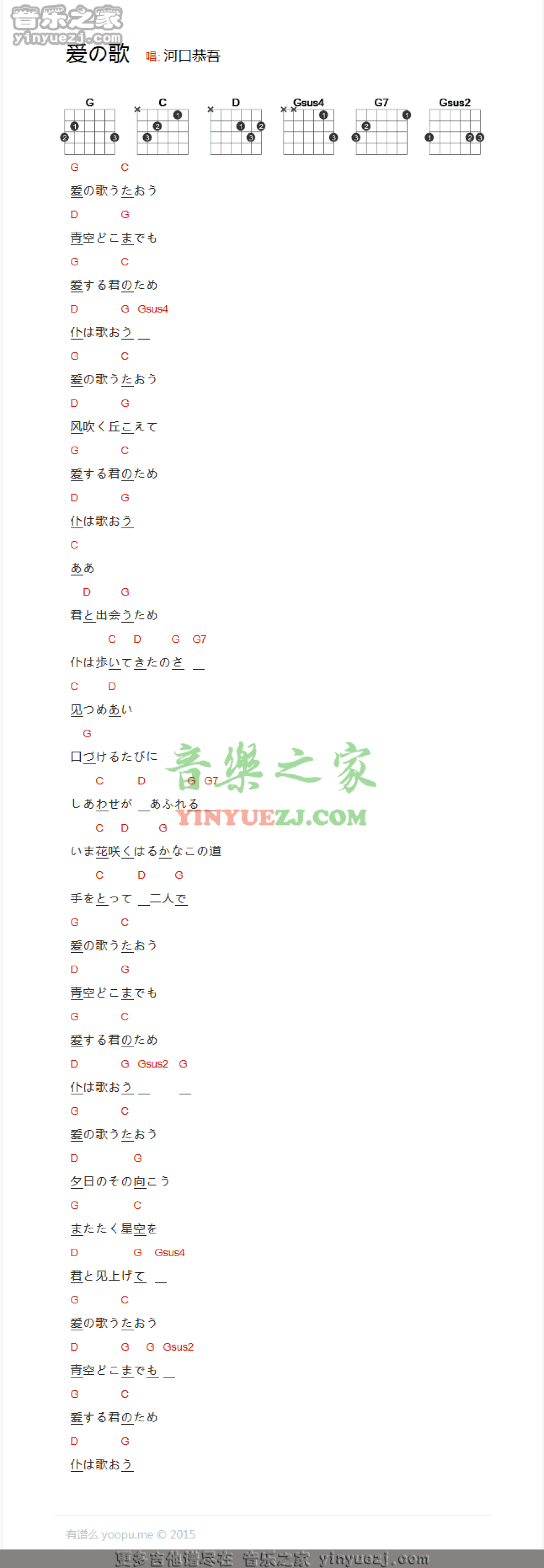 曲谱介绍: 河口恭吾《爱的歌》吉他谱(和弦txt谱)