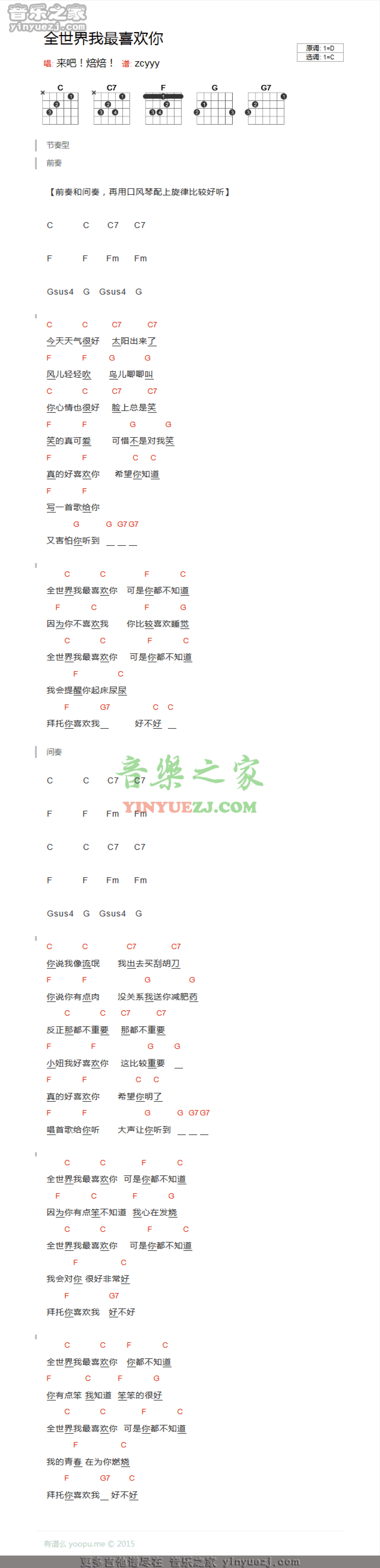 全世界我最喜欢你吉他谱 - 来吧!焙焙! - C调吉他弹唱谱 - 和弦谱