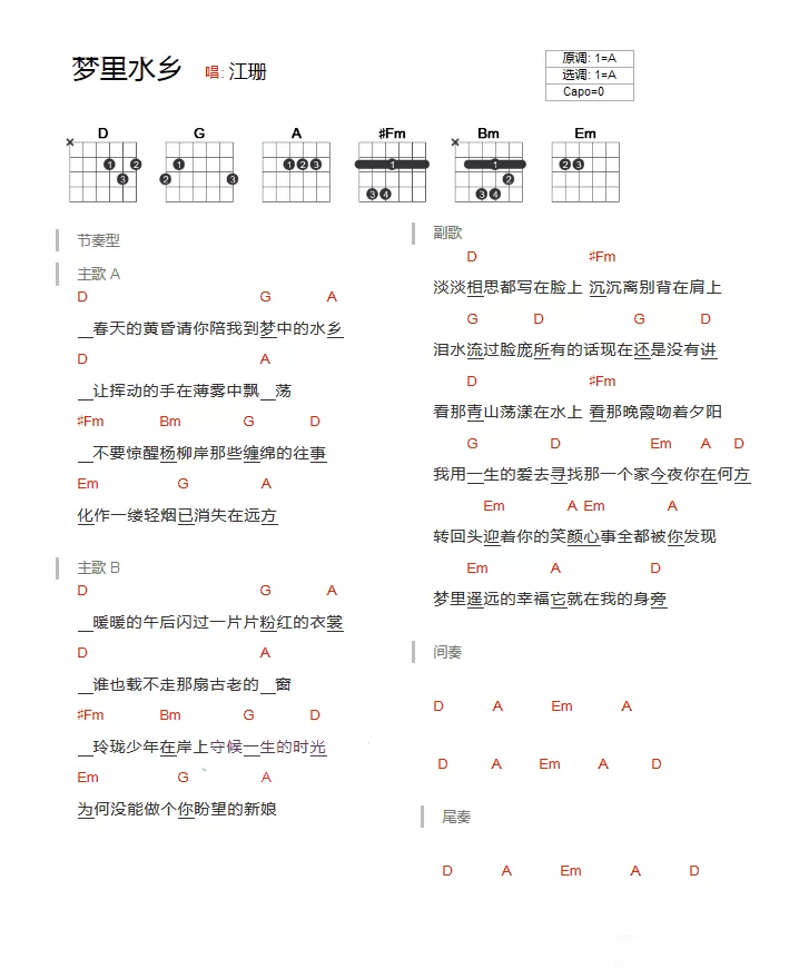 梦里水乡吉他谱 - 江珊 - A调吉他弹唱谱 - 和弦谱