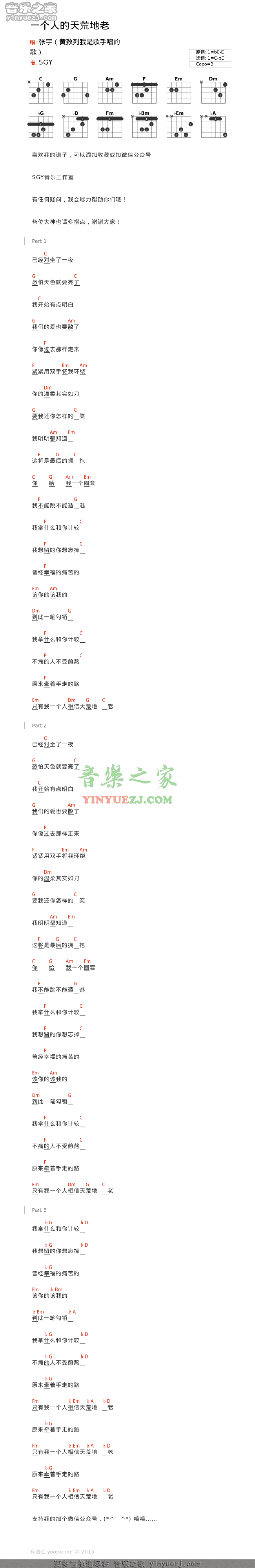 曲谱介绍: 张宇《一个人的天荒地老》吉他谱(和弦t