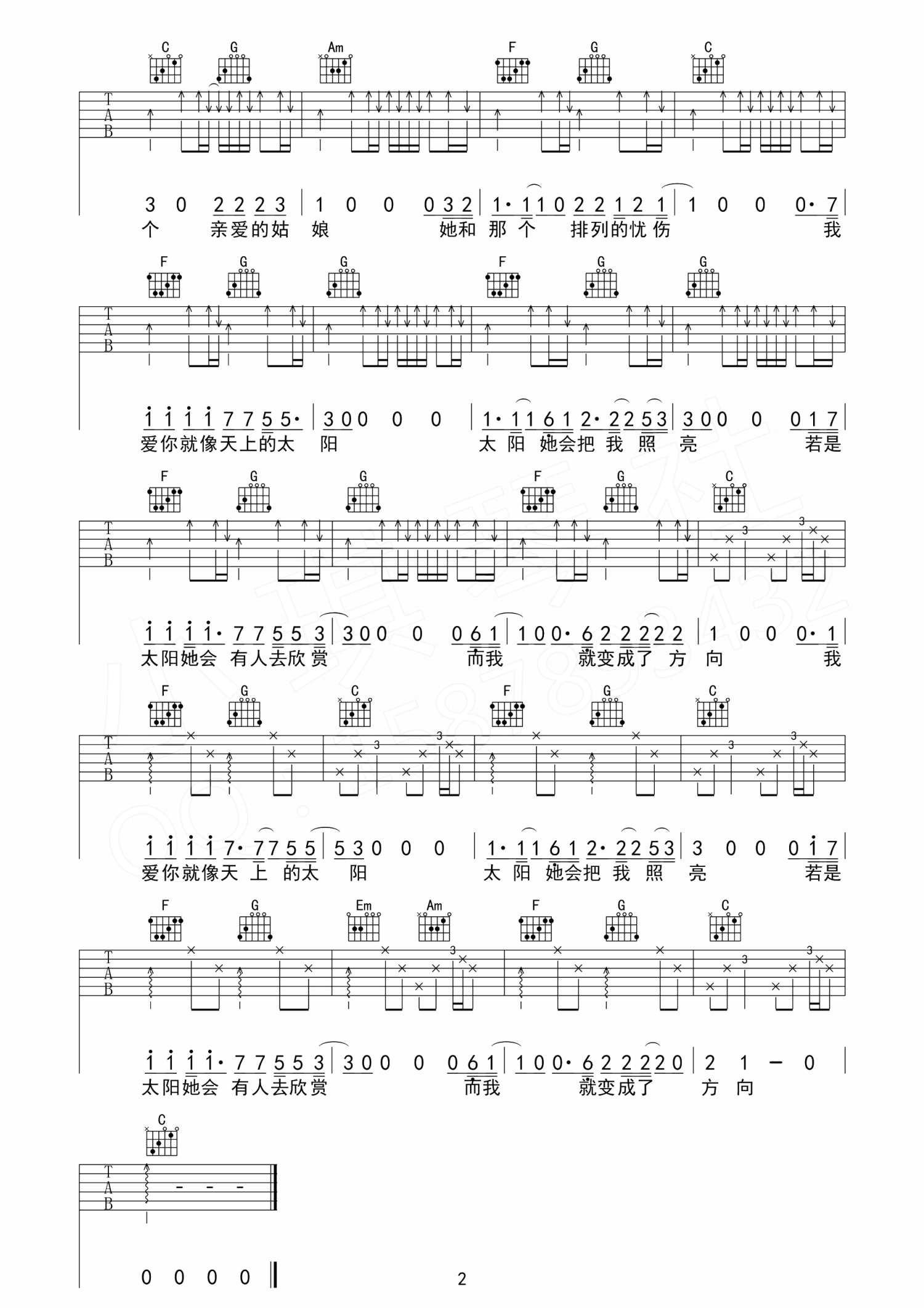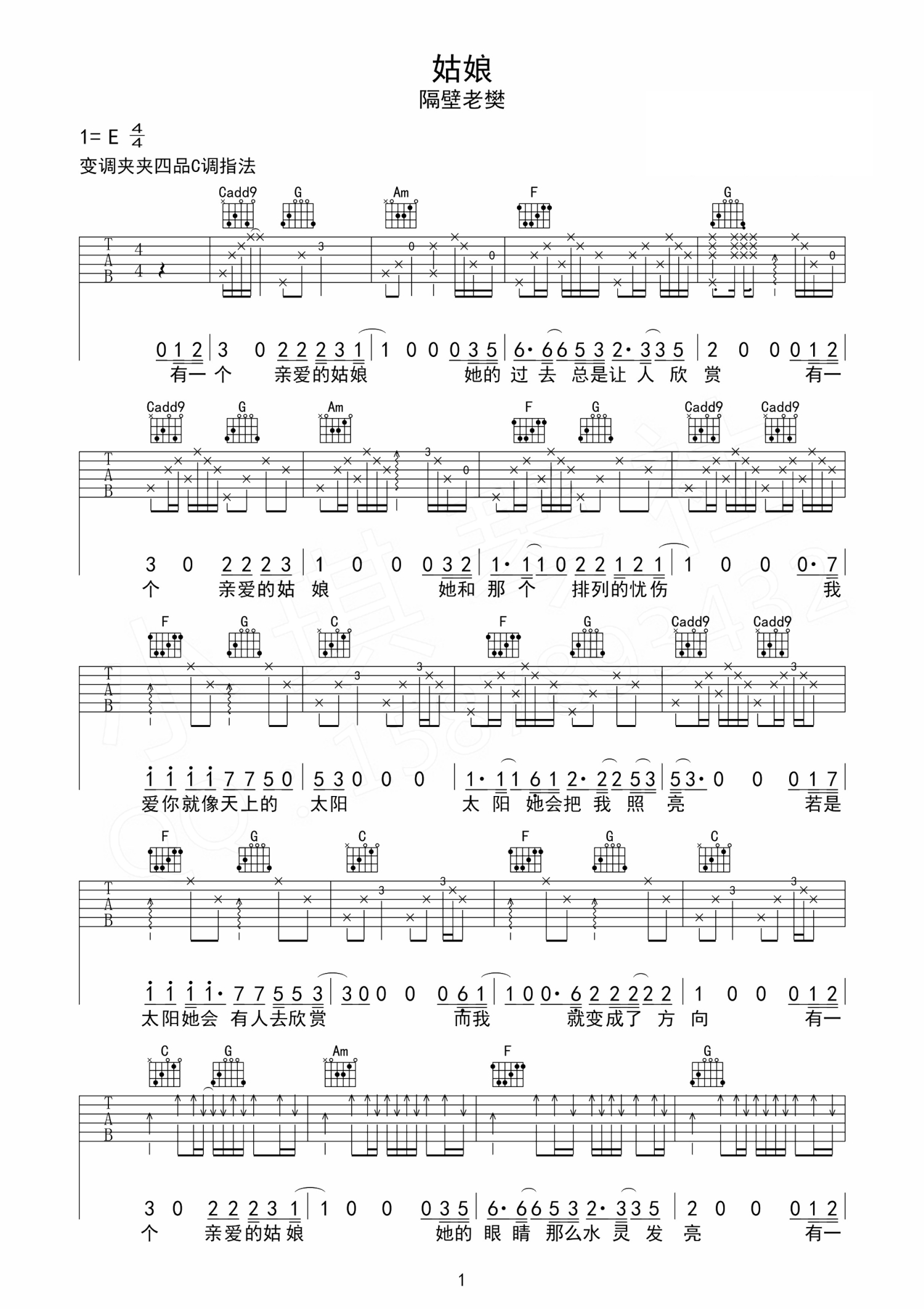 曲谱介绍: 《姑娘》吉他谱 C调指法 隔壁老樊(cower王北车)