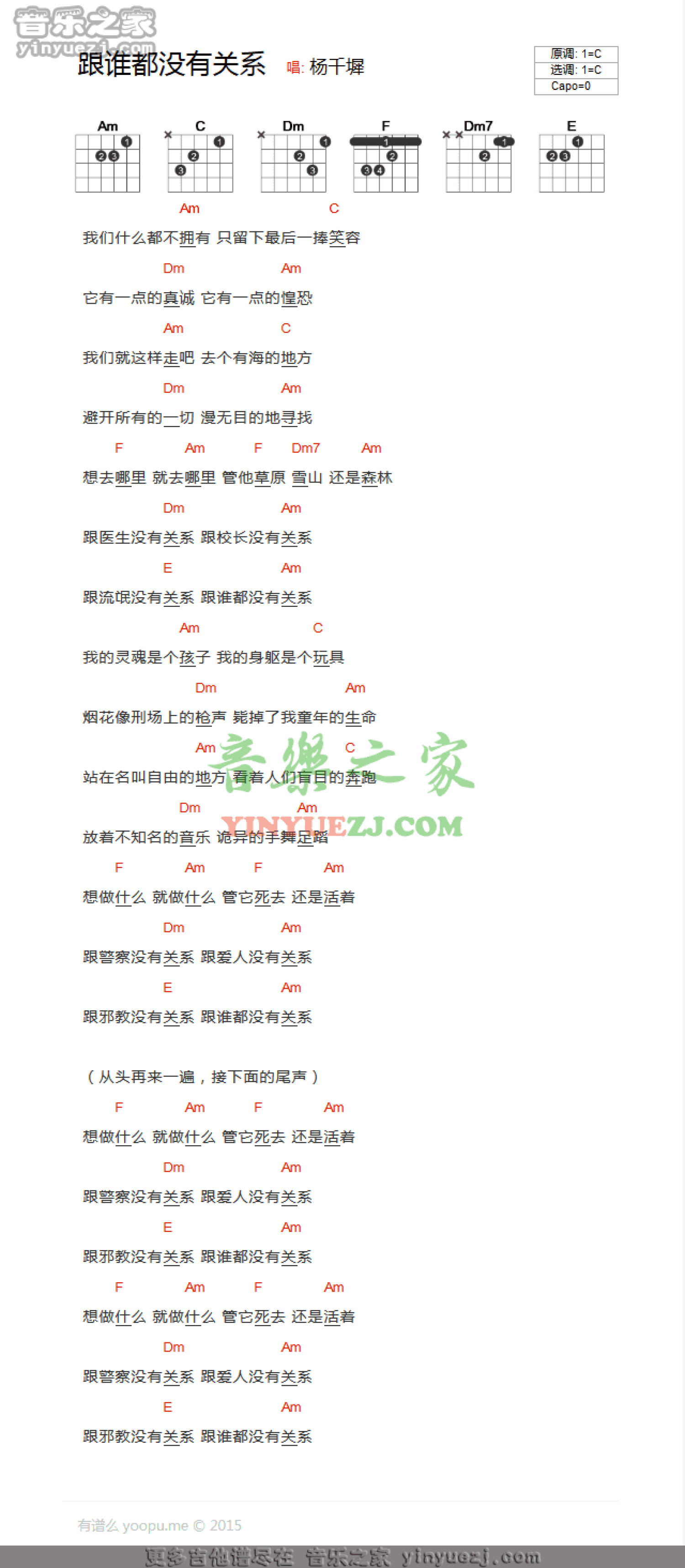 跟谁都没有关系吉他谱 - 杨千墀 - C调吉他弹唱谱 - 和弦谱