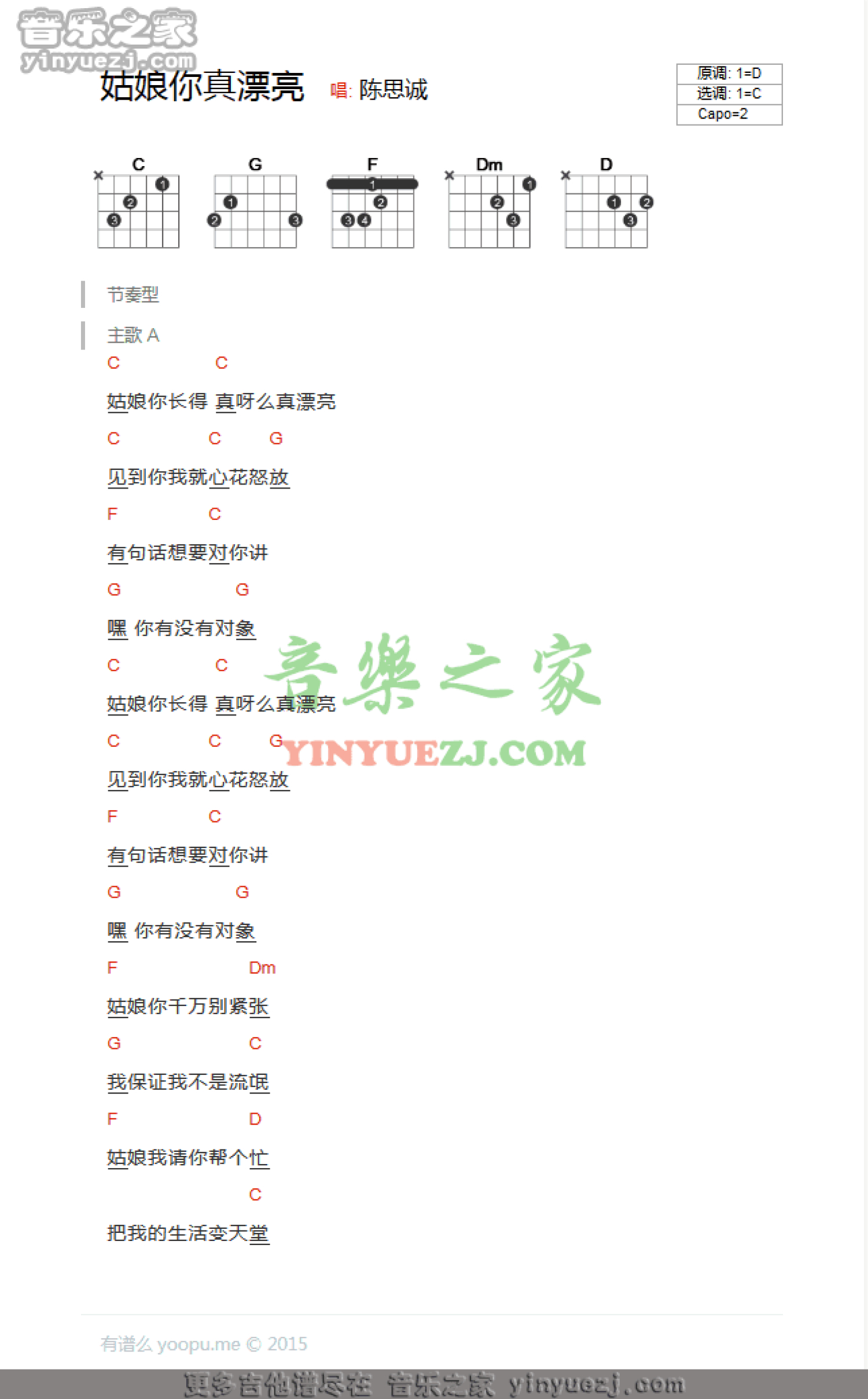 曲谱介绍: 陈思诚《姑娘你长得真漂亮》吉他谱