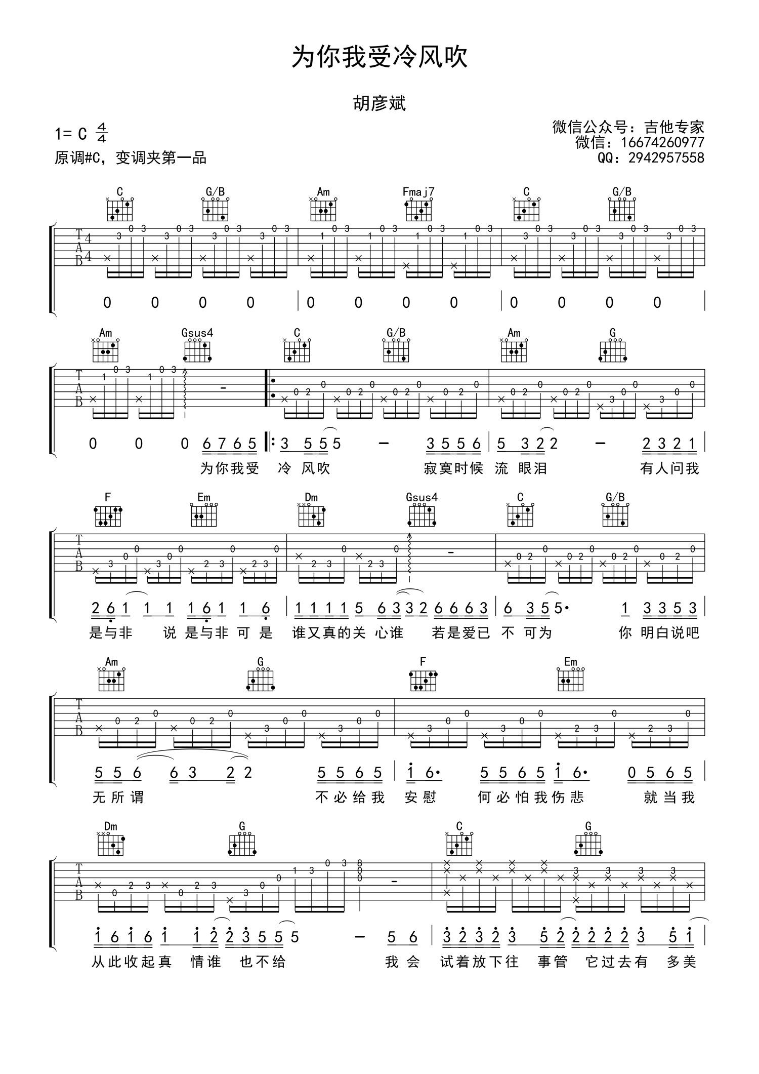 曲谱介绍: 为你我受冷风吹吉他谱 胡彦斌 C调高清弹唱谱
