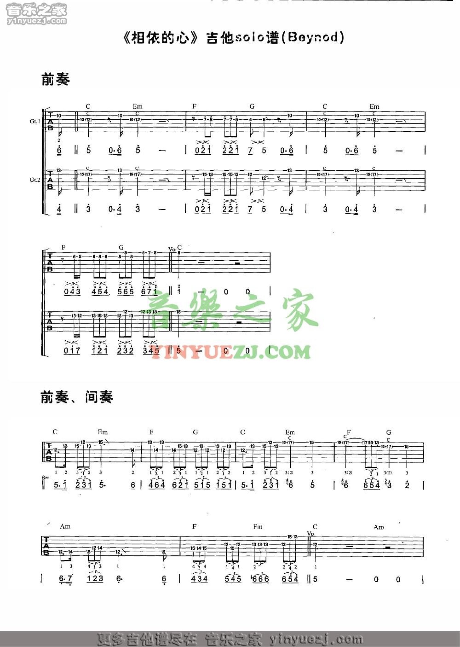 曲谱介绍: Beyond《相依的心》solo吉他谱