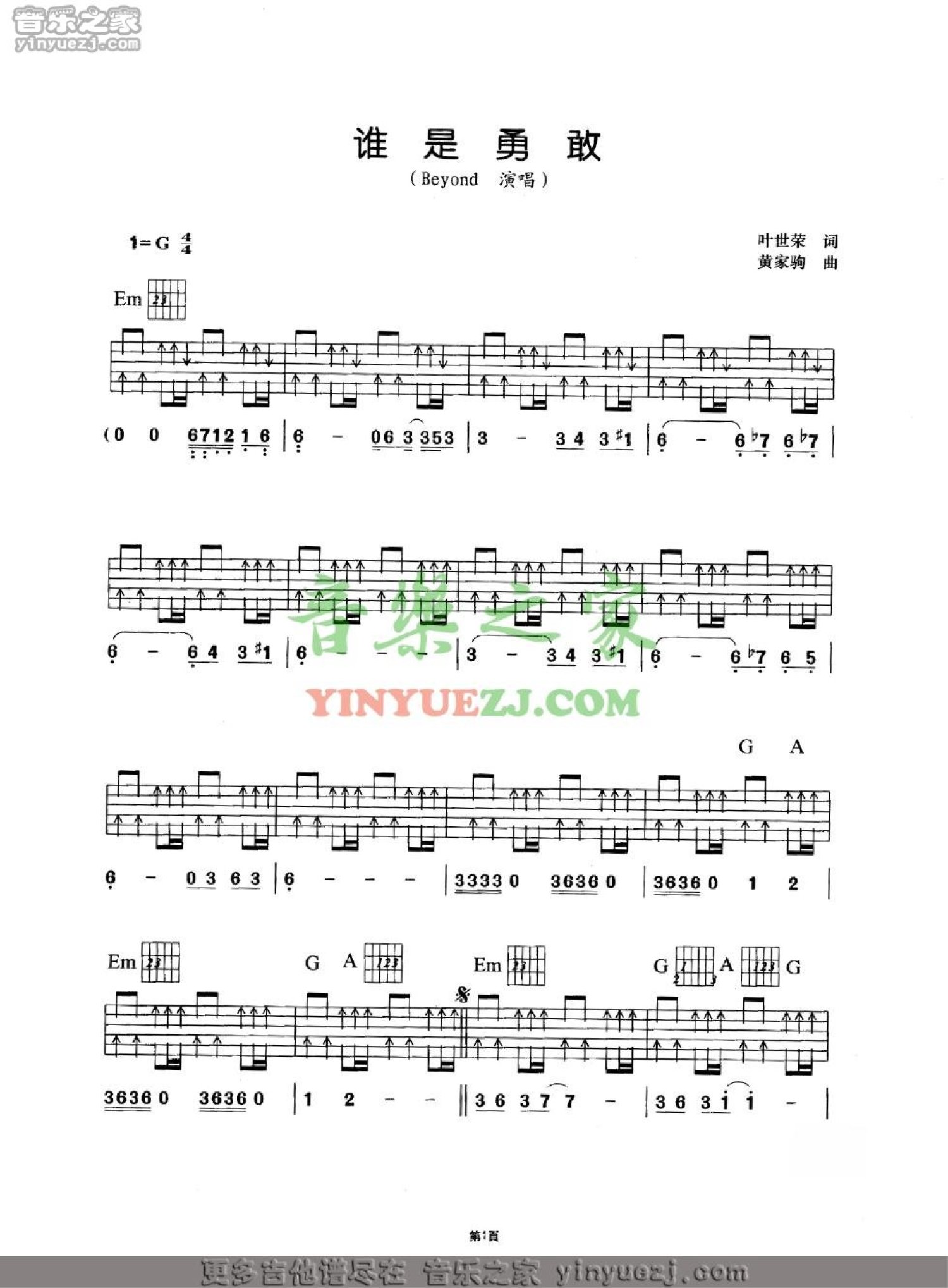 谁是勇敢吉他谱 - Beyond - G调吉他弹唱谱