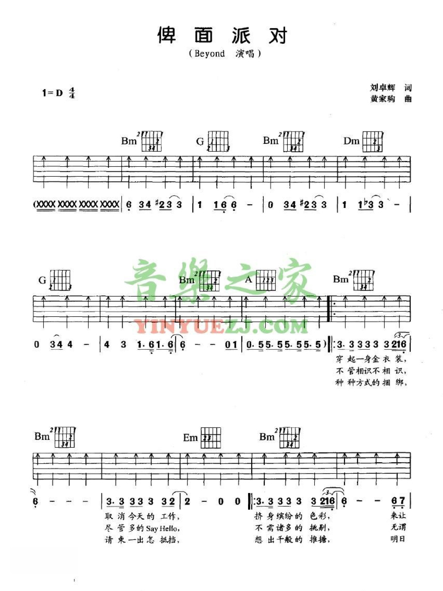 俾面派对吉他谱 - Beyond - D调吉他弹唱谱