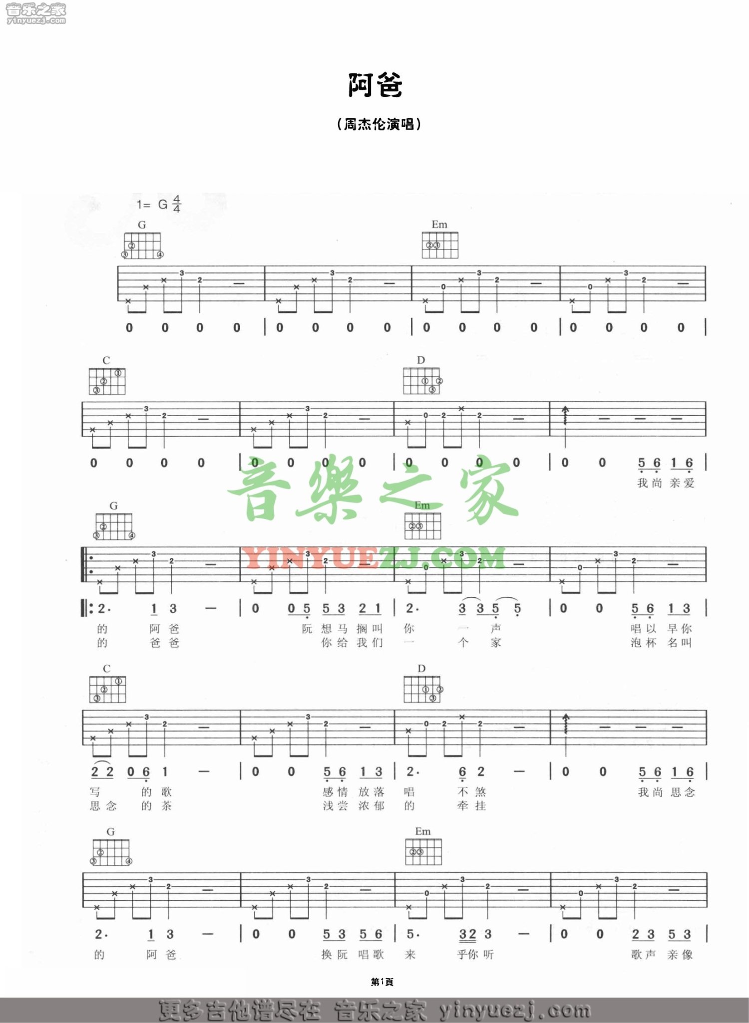 阿爸吉他谱 - 周杰伦 - G调吉他弹唱谱
