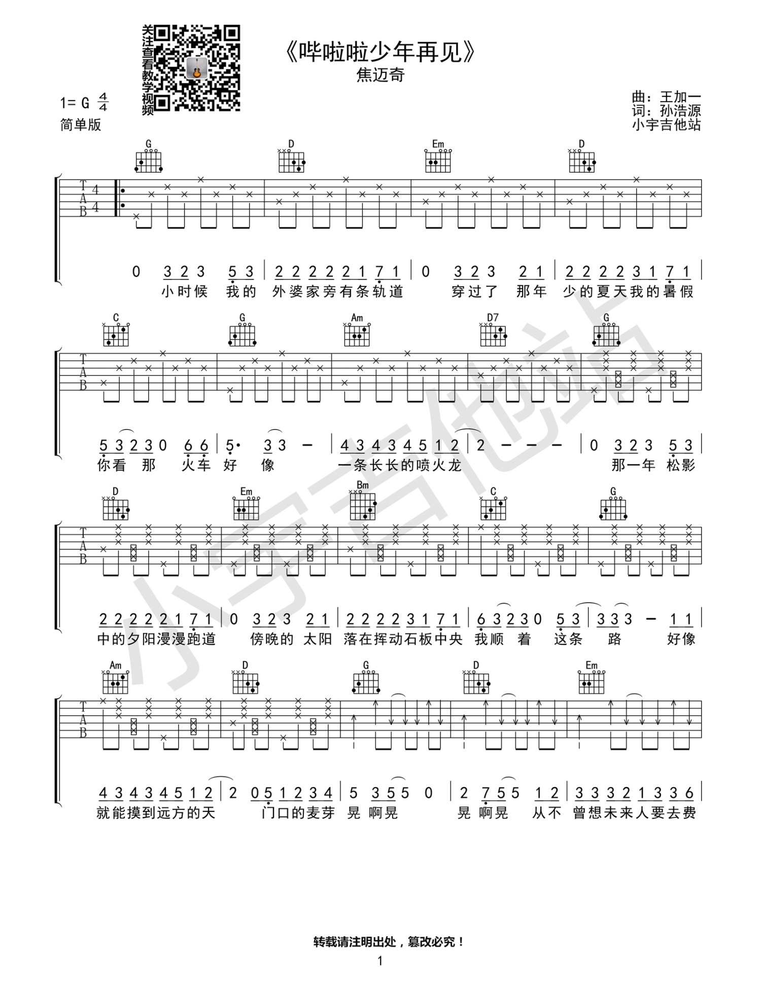 曲谱介绍: 哗啦啦少年再见吉他谱 焦迈奇 G调简单版