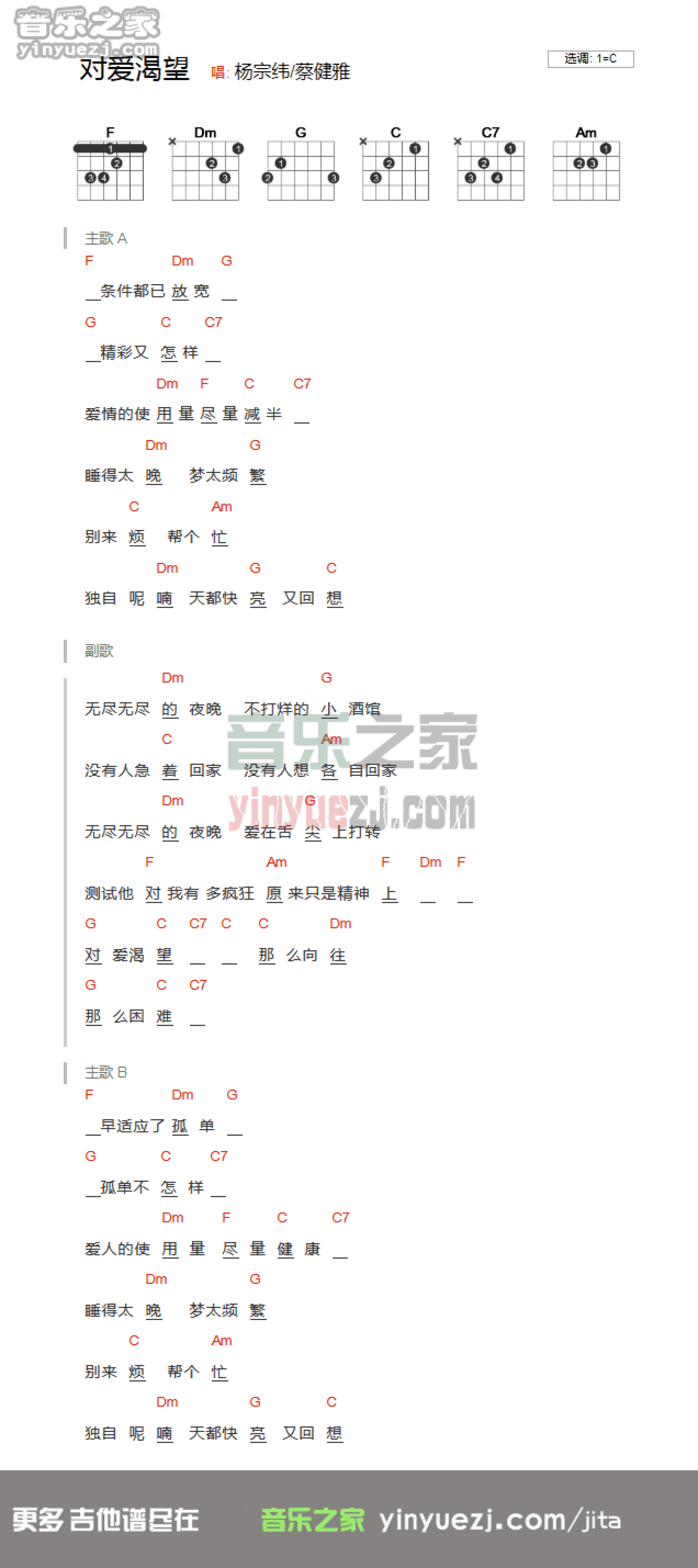 对爱渴望吉他谱 - 蔡健雅/杨宗纬 - C调吉他弹唱谱 - 和弦谱