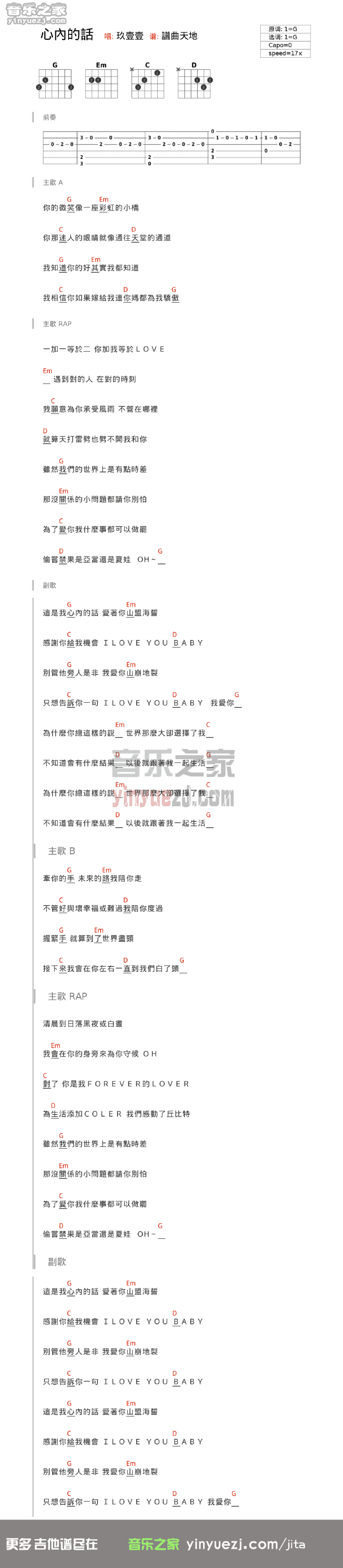 曲谱介绍: G调版 玖壹壹《心内的话》吉他和弦弹唱谱