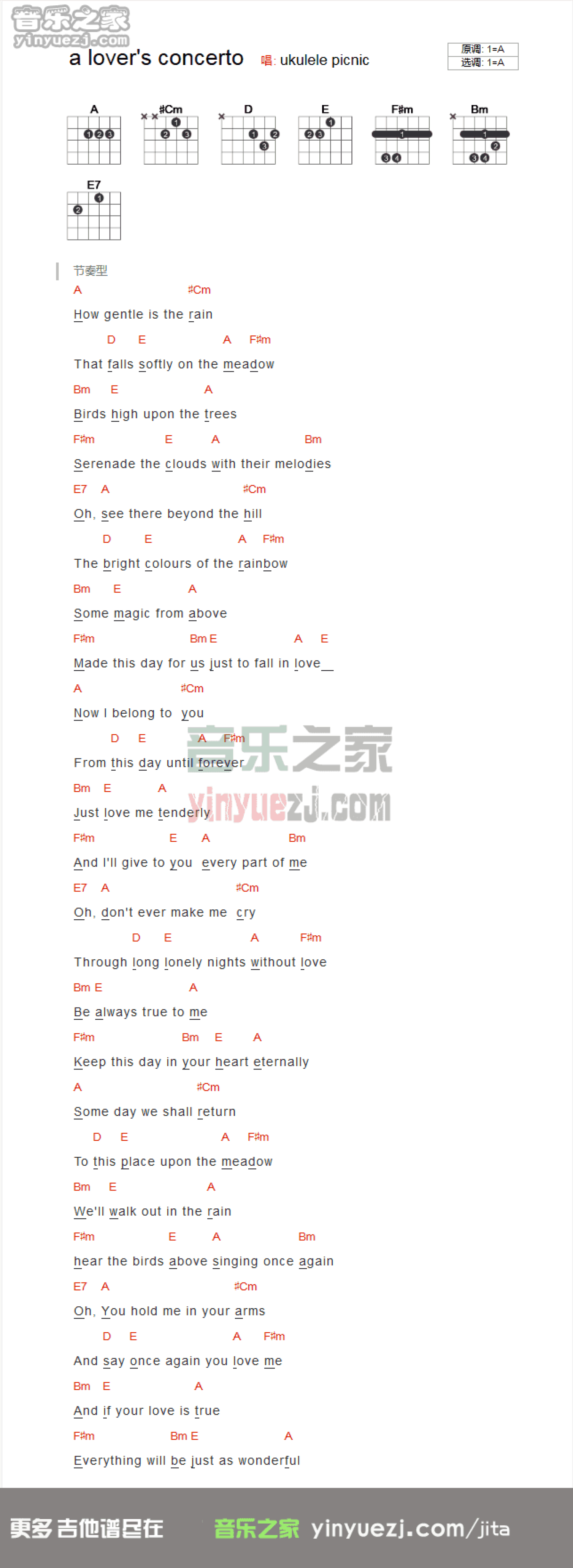 曲谱介绍: A调版 恋人协奏曲《a lovers concerto》吉他和弦弹唱谱