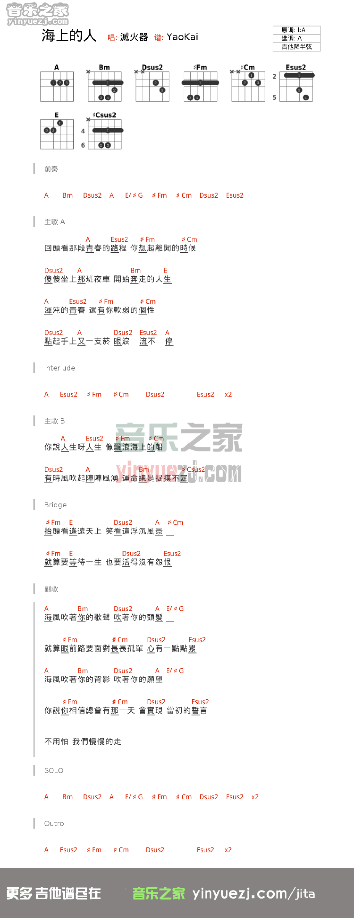曲谱介绍: A调版灭火器《海上的人》吉他和弦弹唱谱