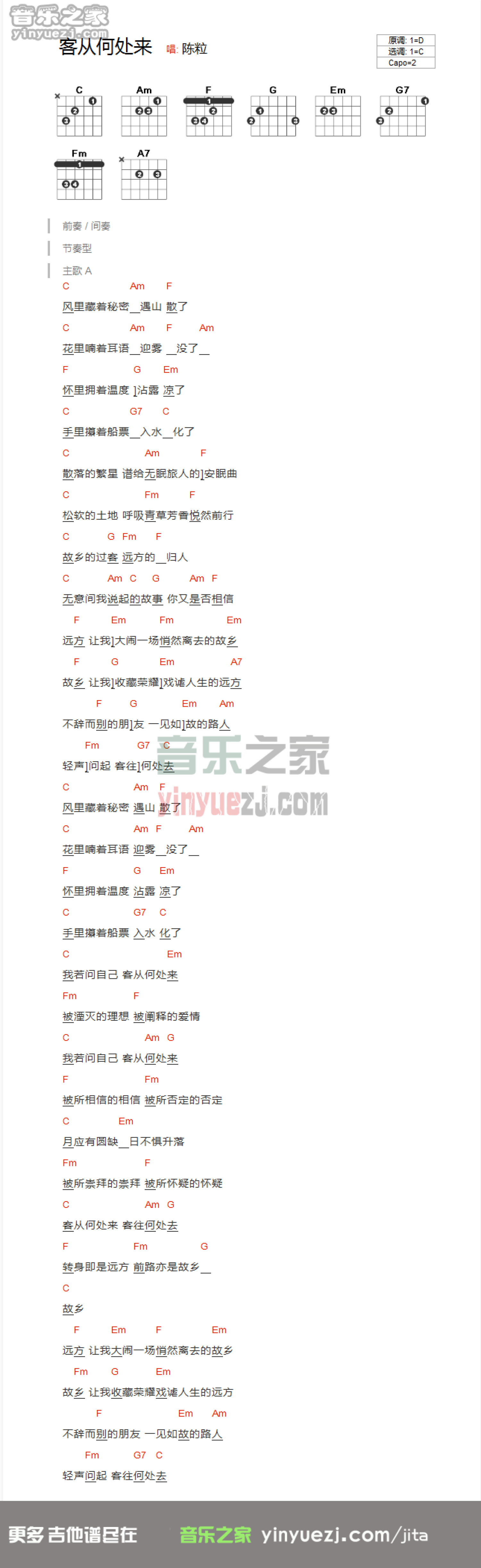 客从何处来吉他谱 - 燕池/陈粒 - C调吉他弹唱谱 - 和弦谱