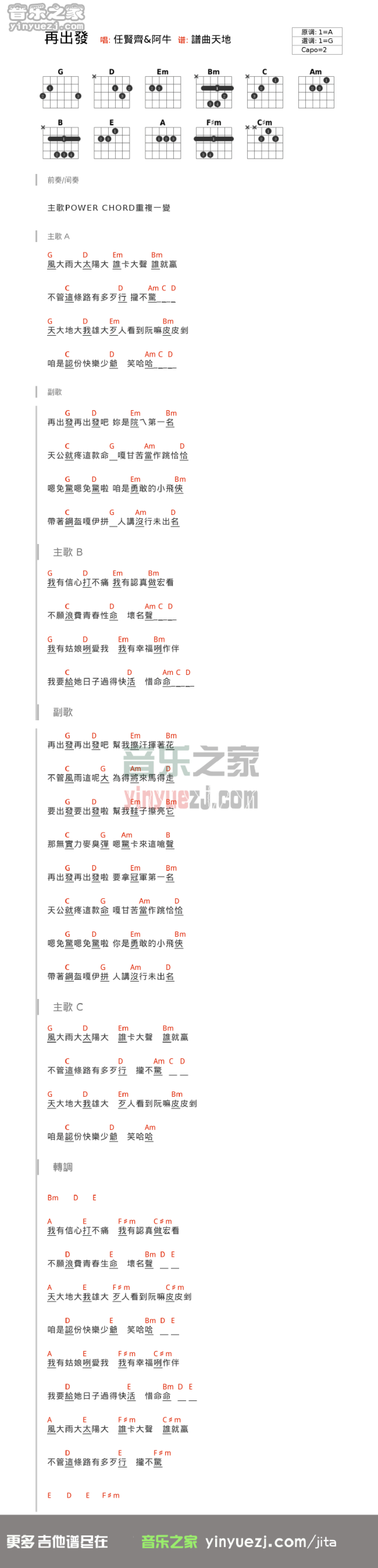 曲谱介绍: G调版任贤齐/阿牛《再出发》和弦谱