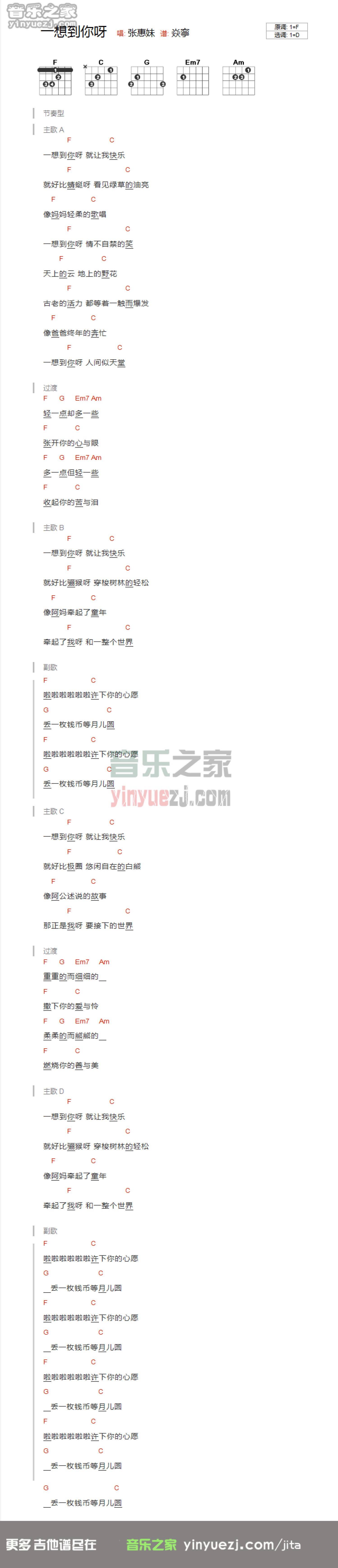 曲谱介绍: D调版张惠妹《一想到你呀》吉他和弦弹唱谱