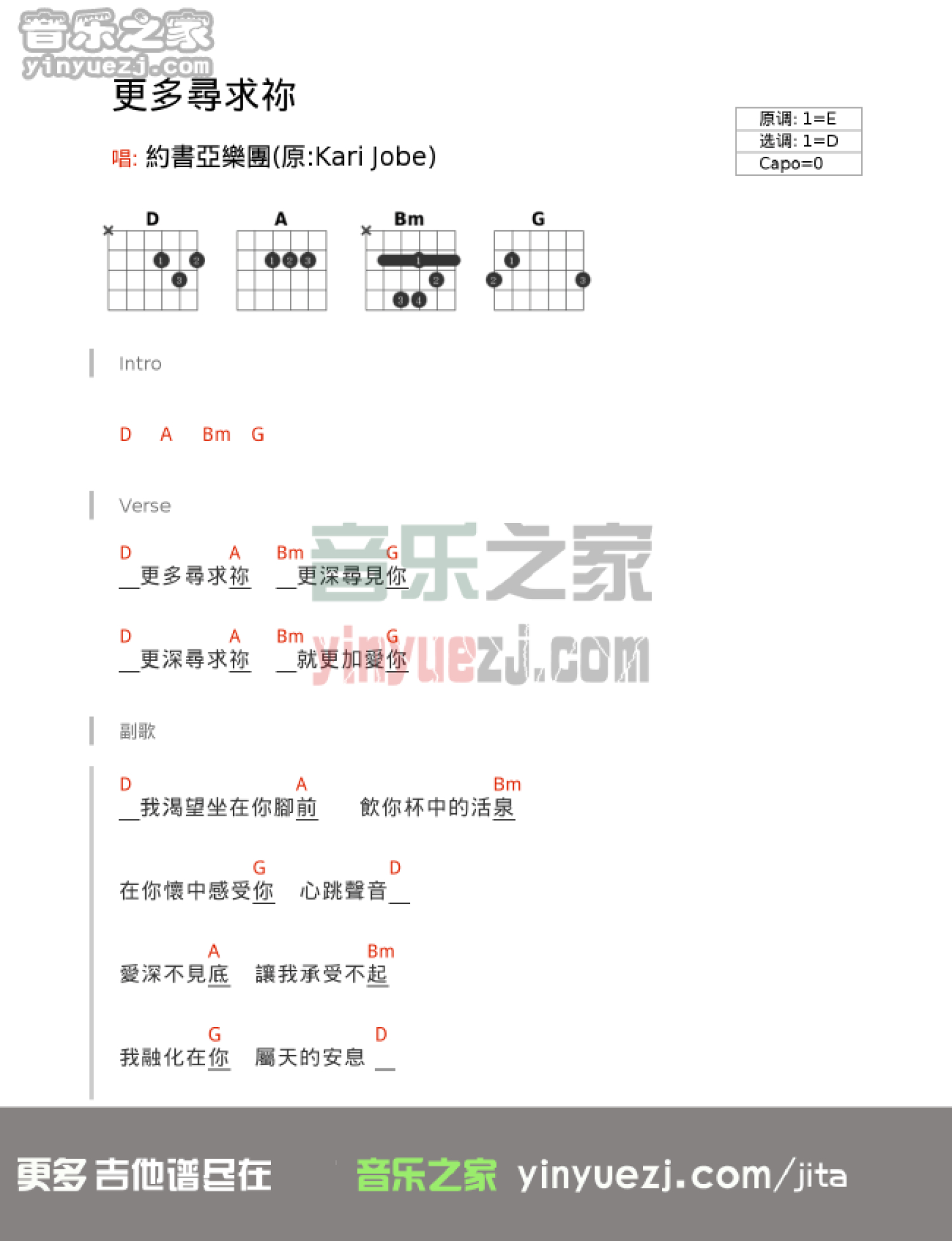曲谱介绍: D调版约书亚《更多寻求你》吉他和弦弹唱谱