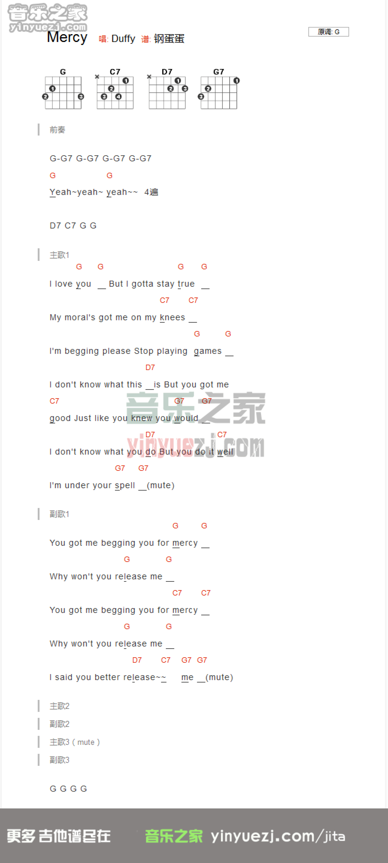 曲谱介绍: G调版Duffy《mercy》吉他和弦弹唱谱