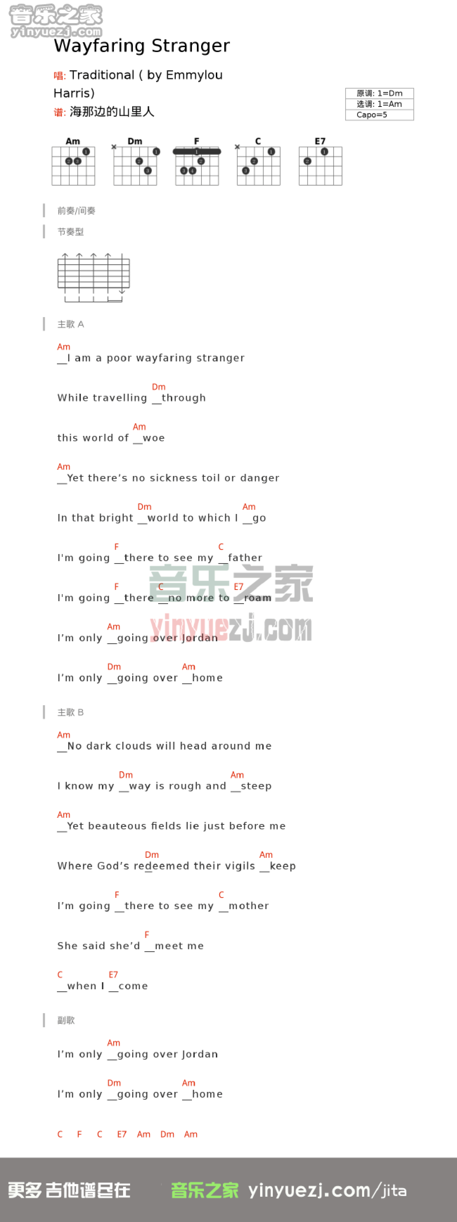 曲谱介绍: 《WayfaringStranger》吉他和弦弹唱谱