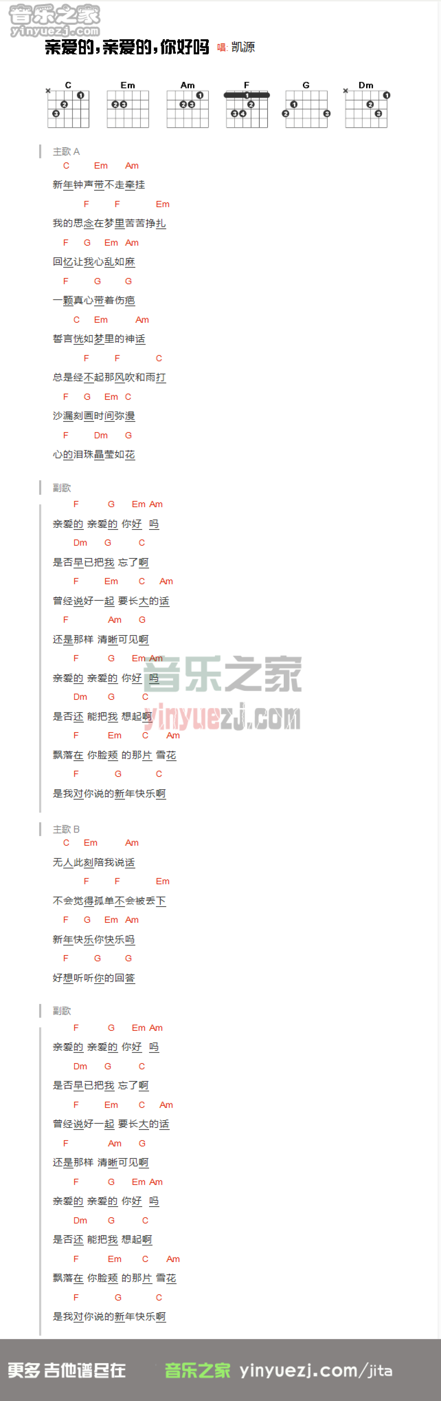 亲爱的亲爱的你好吗吉他谱 - 凯源 - 吉他弹唱谱 - 和弦谱
