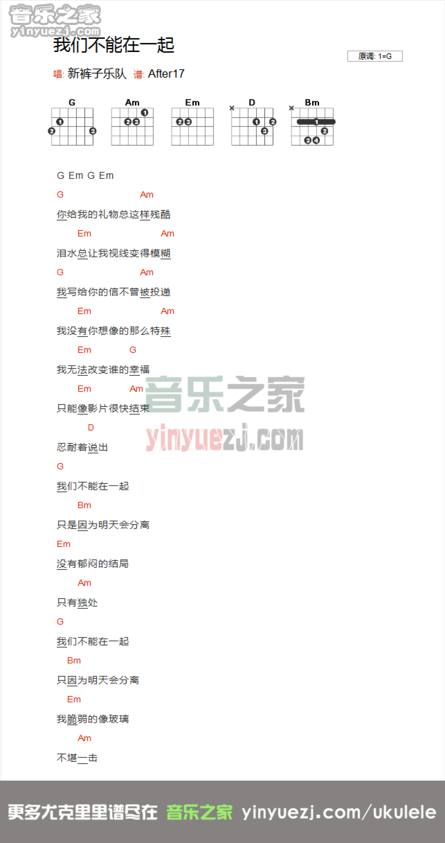 曲谱介绍: G调版新裤子《我们不能在一起》吉他和弦弹唱谱