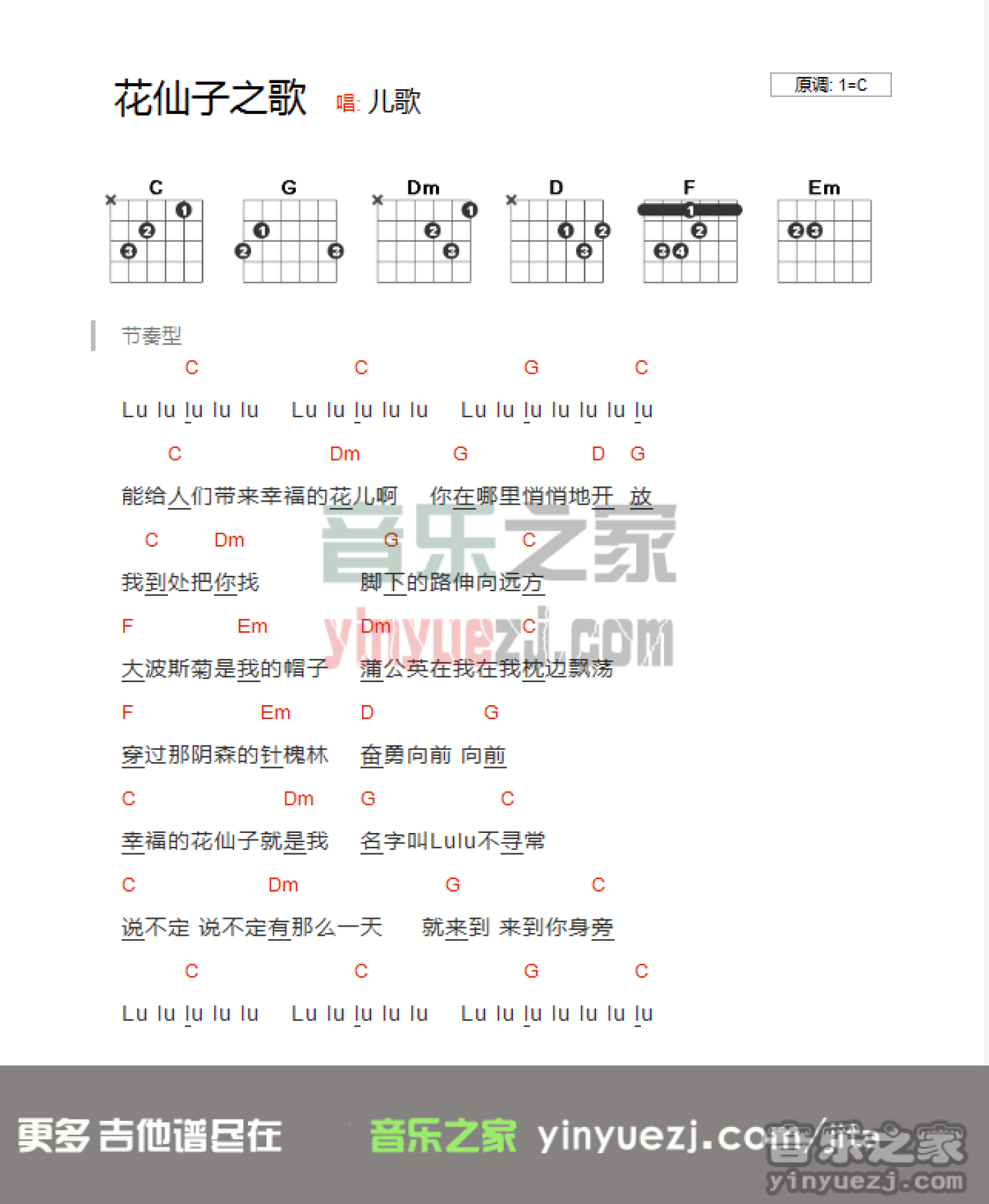 曲谱介绍: C调版儿歌《花仙子之歌》吉他和弦弹唱谱