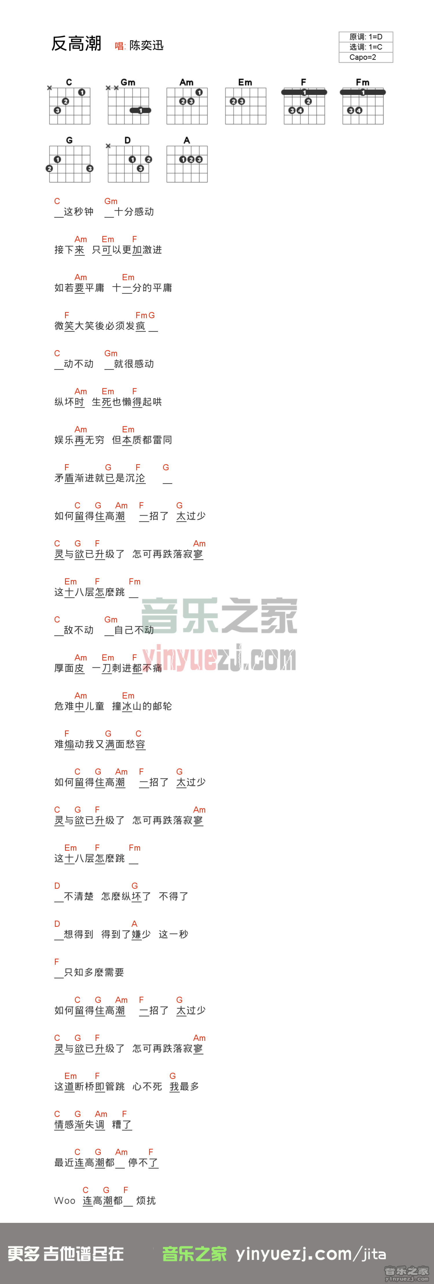 曲谱介绍: C调版 陈奕迅《反高潮》吉他和弦弹唱谱
