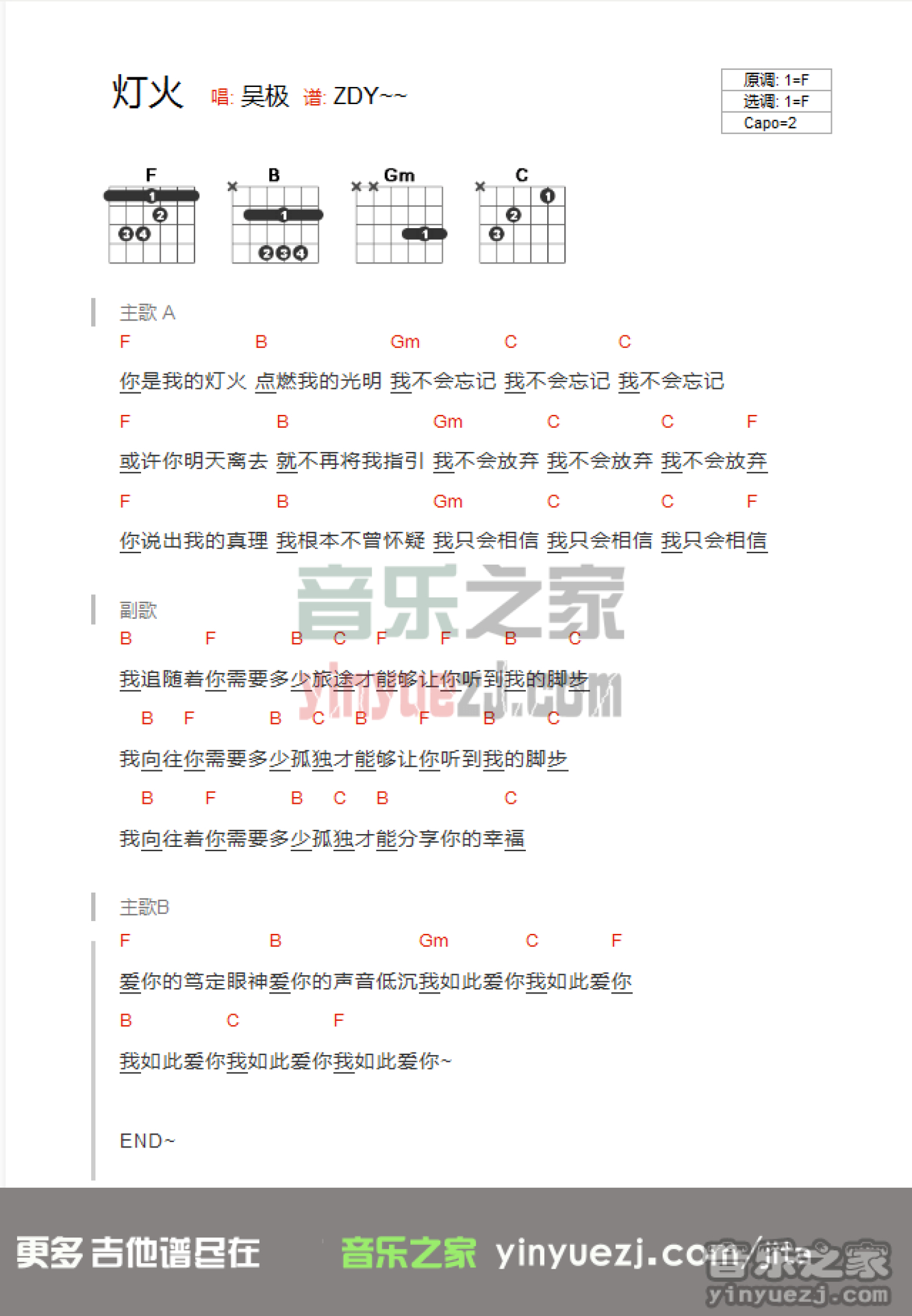 曲谱介绍: F调版吴极《灯火》吉他和弦弹唱谱