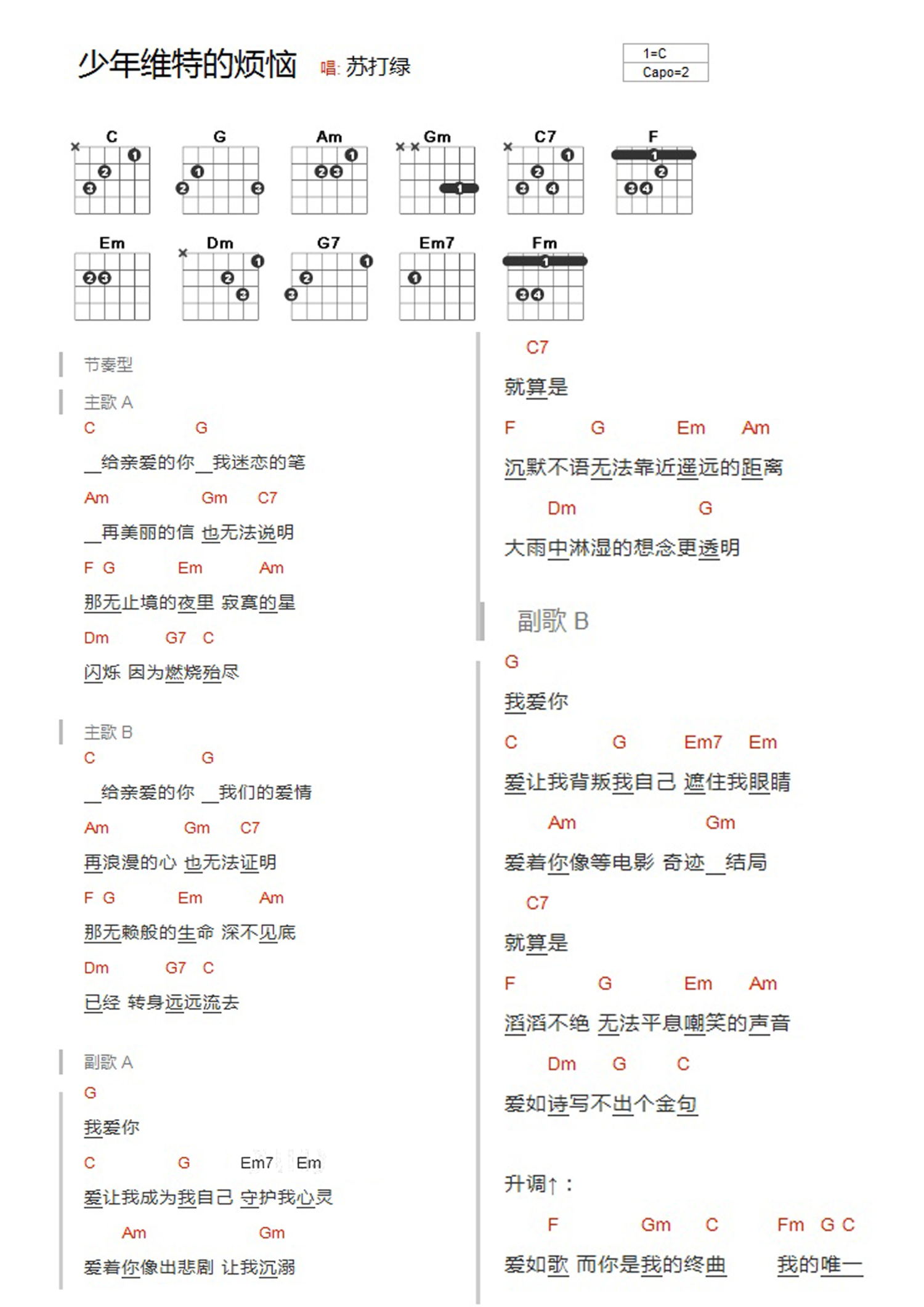 曲谱介绍: C调版苏打绿《少年维特的烦恼》吉他和弦弹唱谱