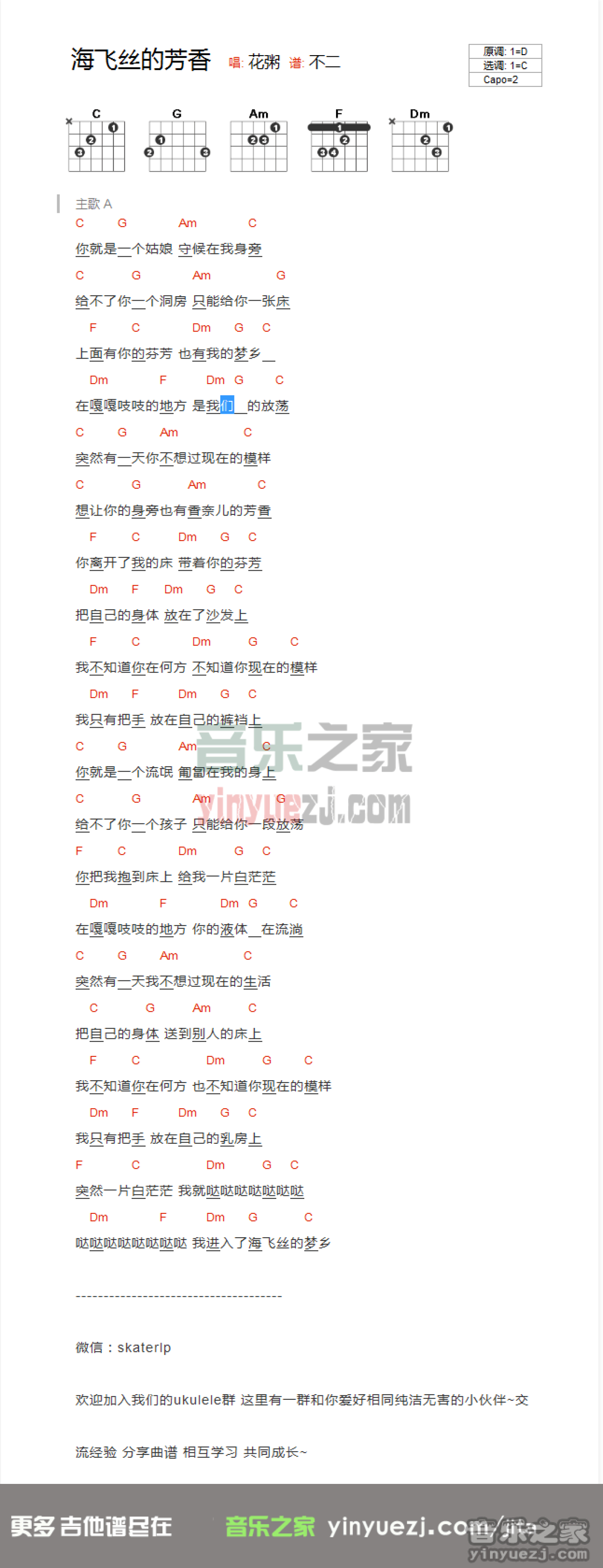 曲谱介绍: C调版 花粥《海飞丝的芳香》吉他和弦弹唱谱