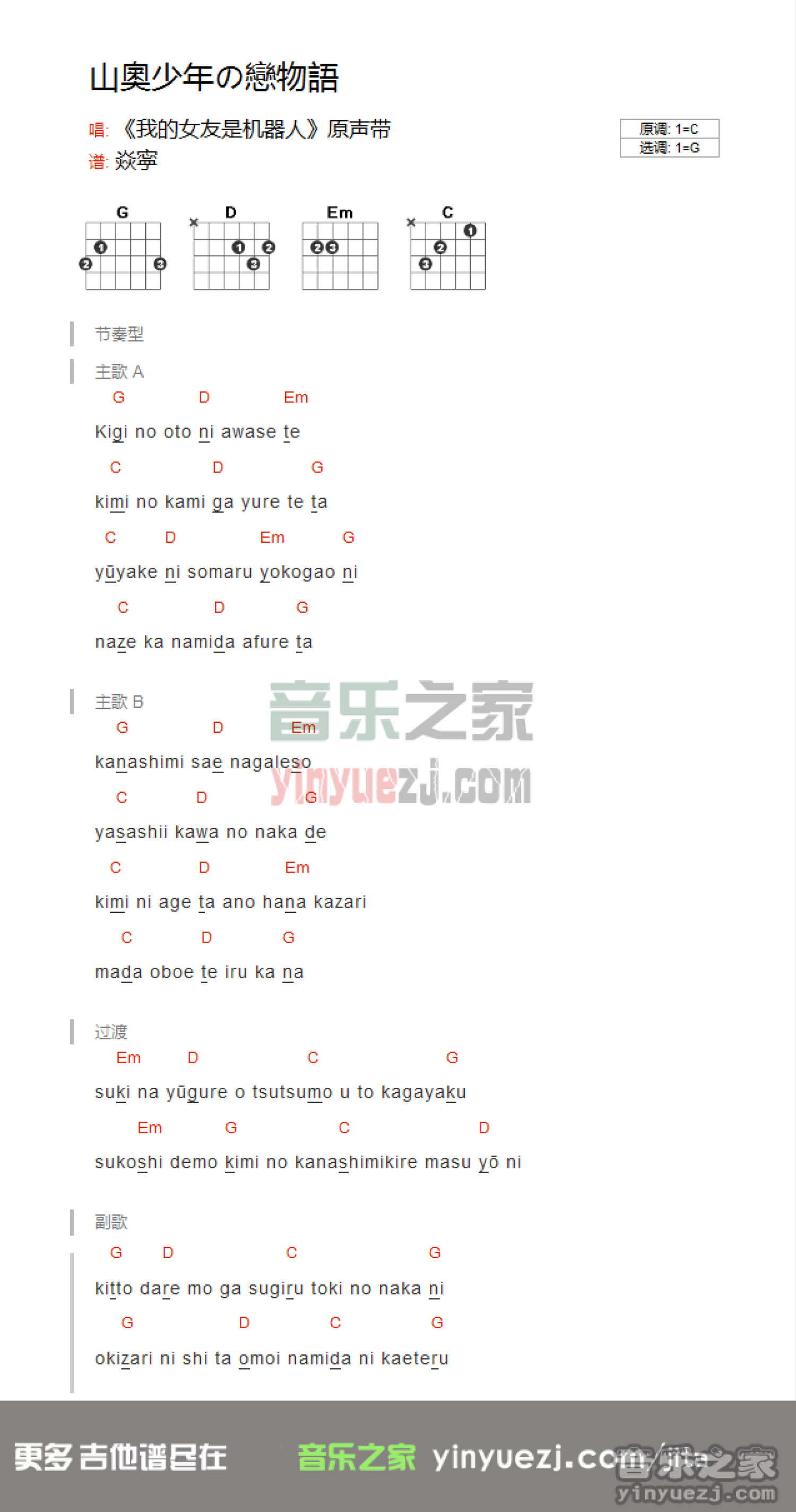 山奥少年の恋物语吉他谱 - 我的女友是机器人 - G调吉他弹唱谱 - 和弦谱
