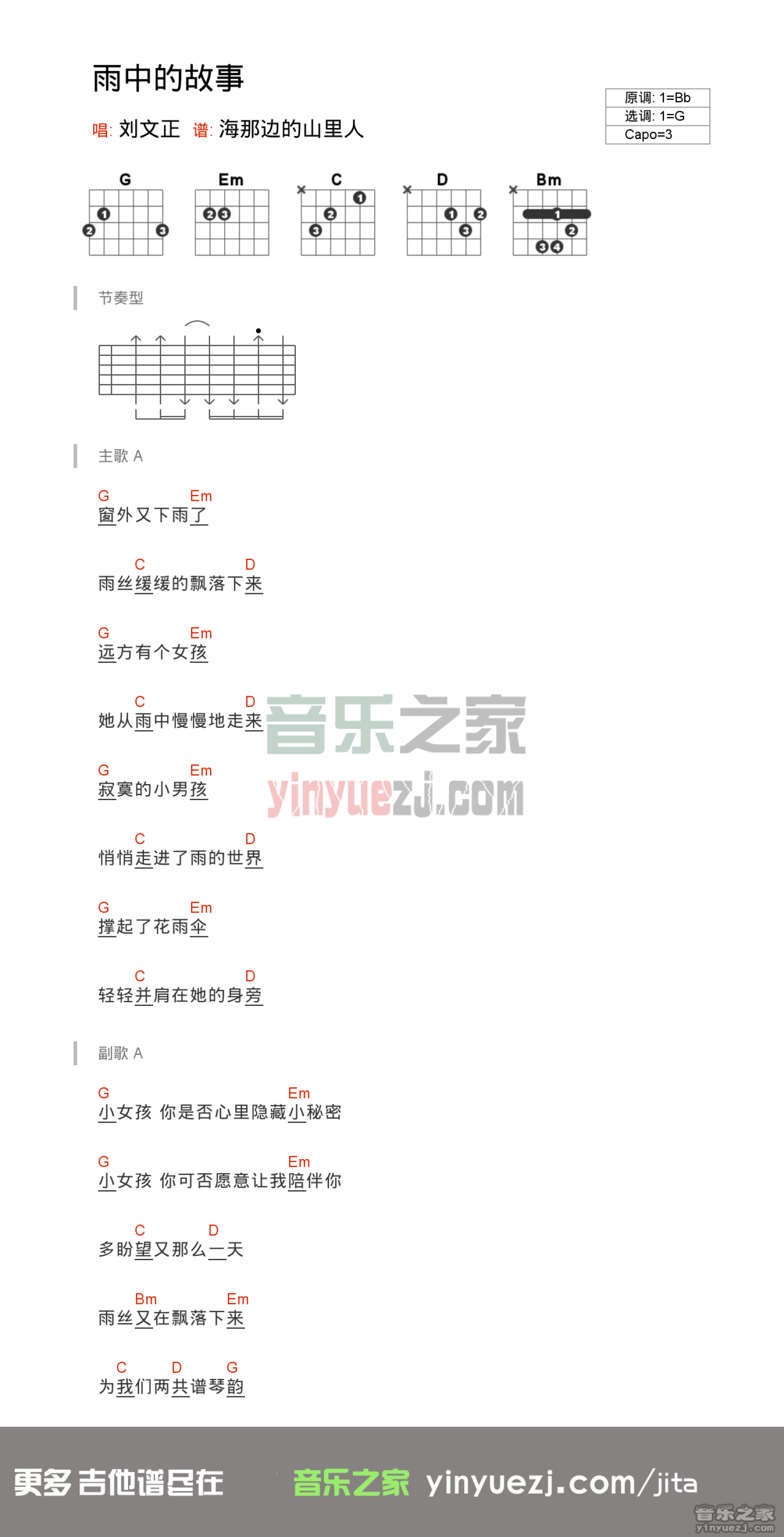曲谱介绍: G调版 刘文正《雨中的故事》吉他和弦弹唱谱