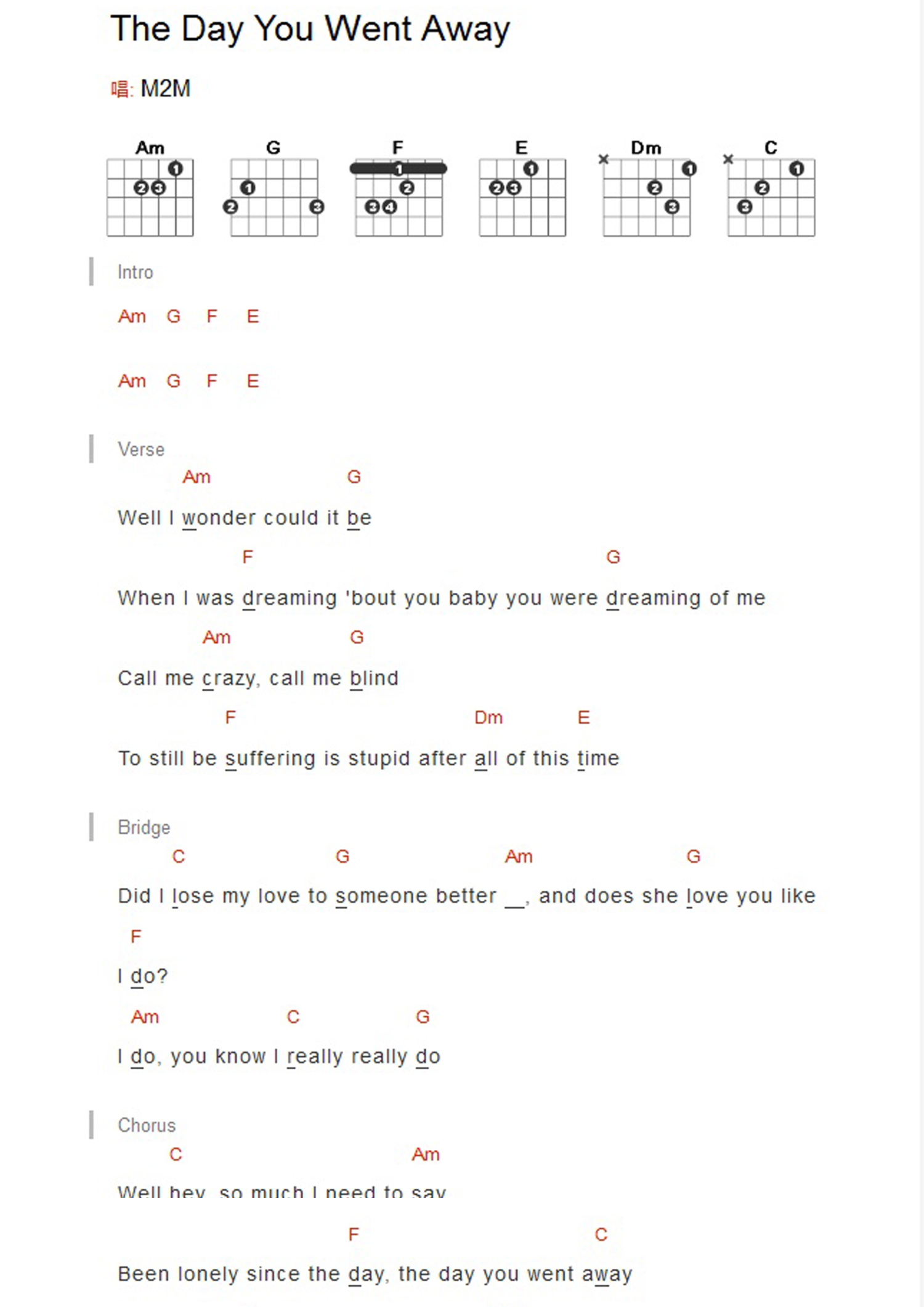 曲谱介绍: M2M《the day you went away》吉他和弦弹唱谱