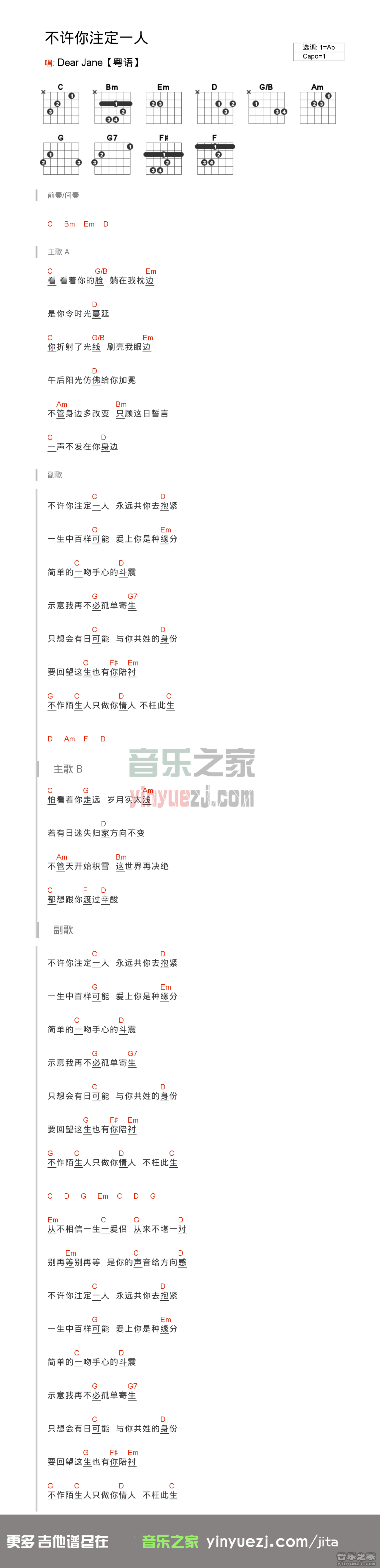 曲谱介绍: Dear Jane《不许你注定一个人》吉他和弦弹唱谱