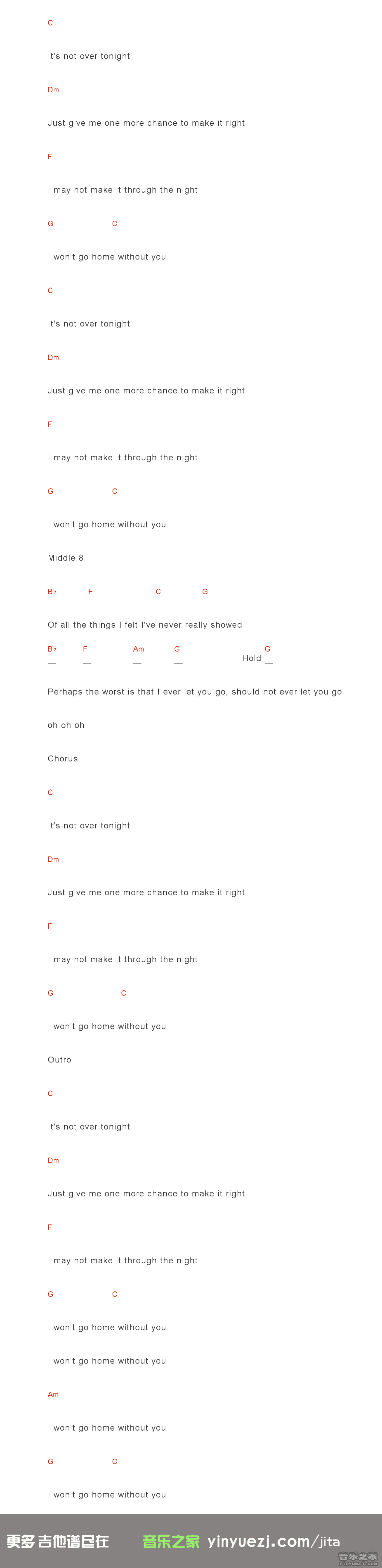 won't go home without you吉他谱 - C调吉他弹唱谱 - 和弦谱