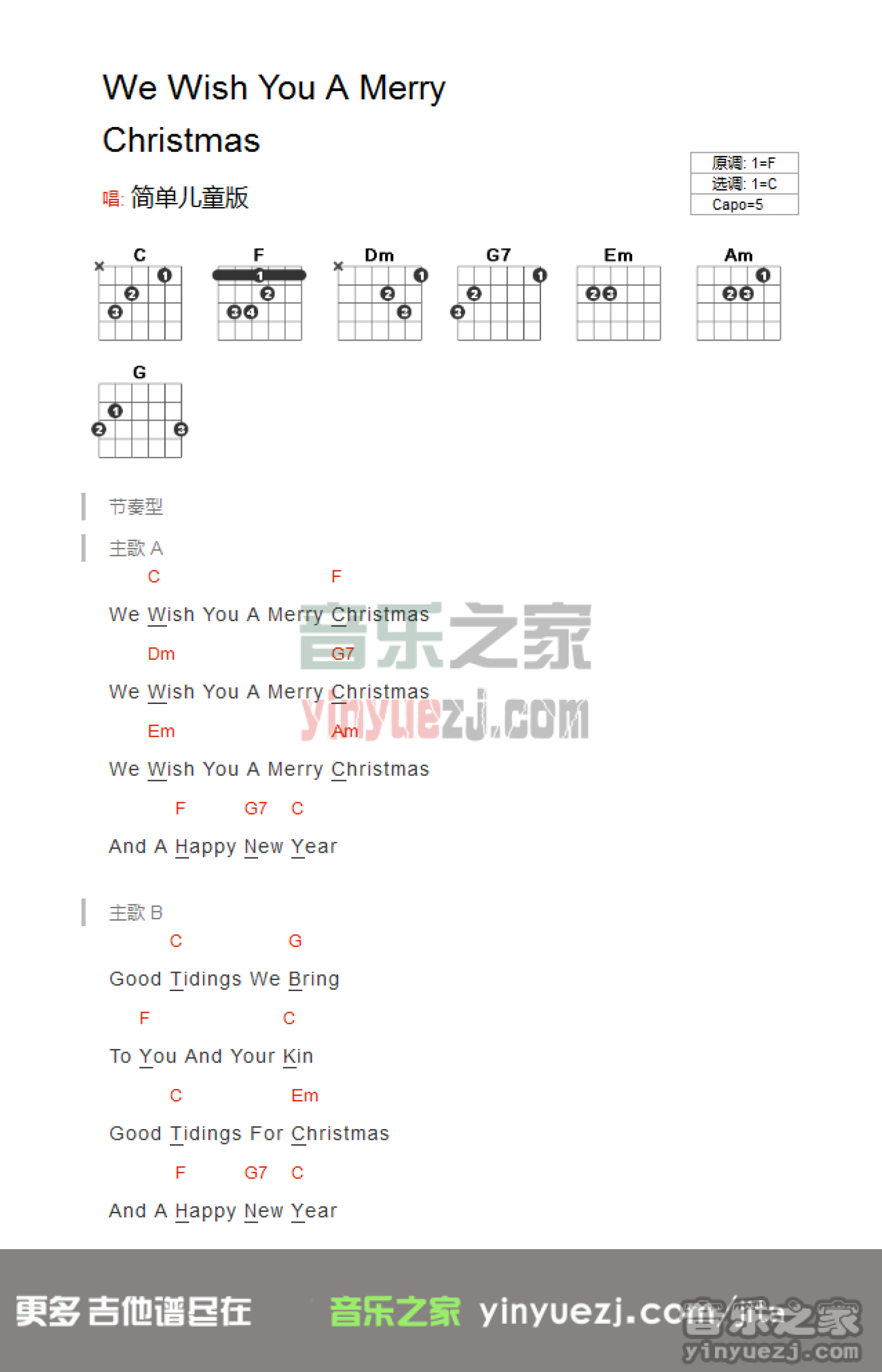 曲谱介绍: C调版 《we wish you a merry christmas》吉他和弦弹唱谱
