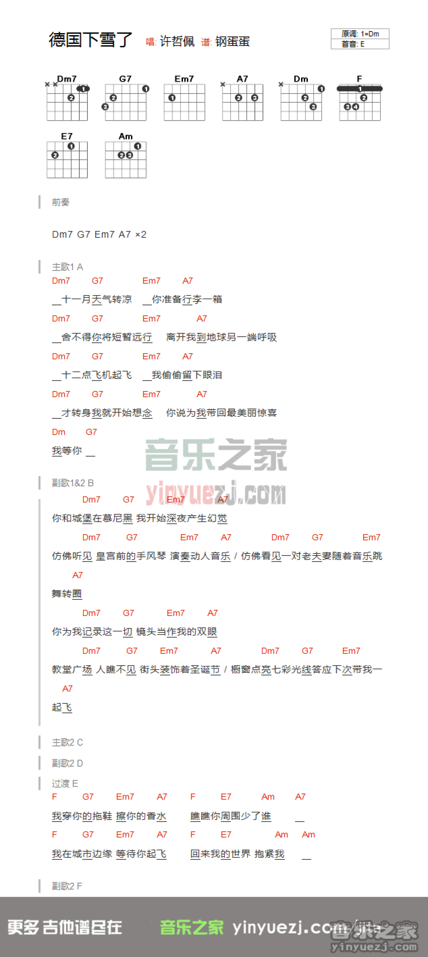 曲谱介绍: E调版许哲佩《德国下雪了》吉他和弦弹唱谱
