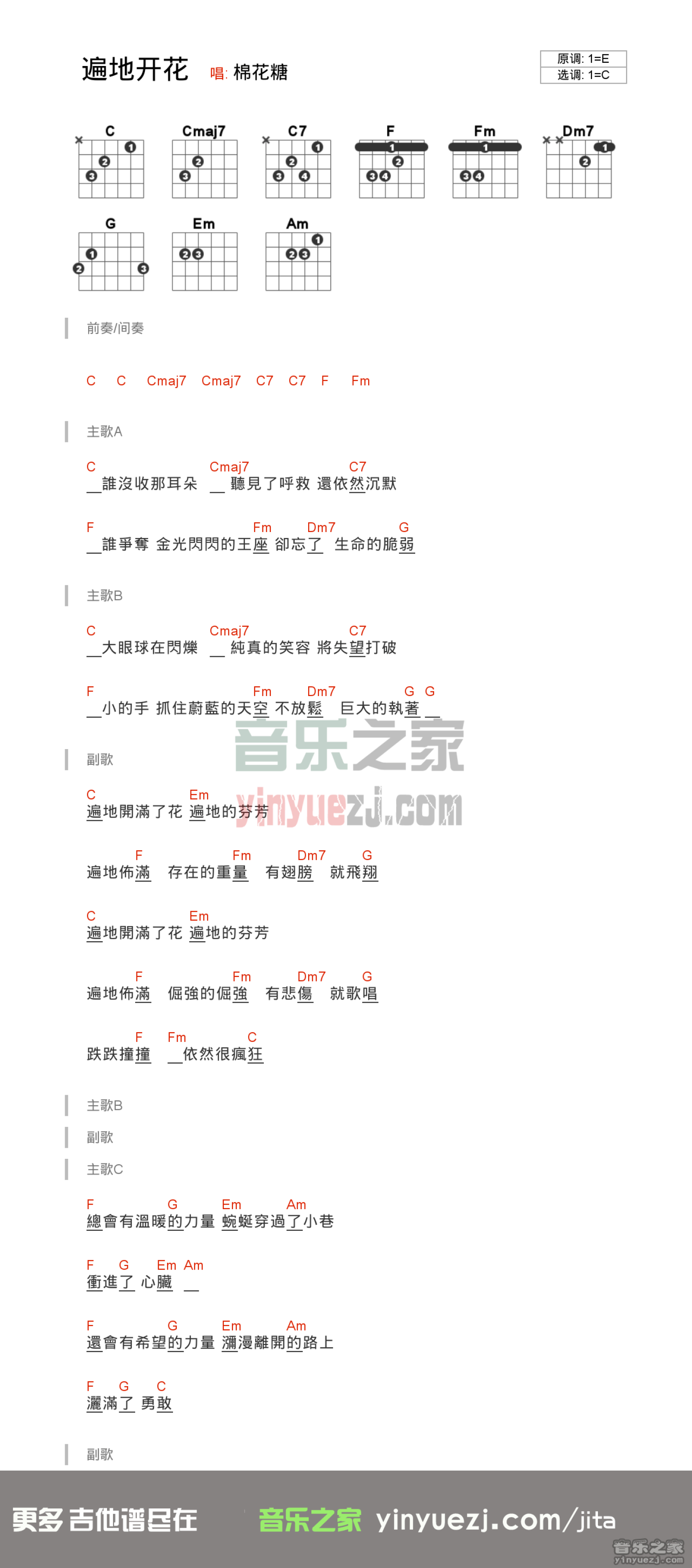 曲谱介绍: C调版棉花糖《遍地开花》吉他和弦弹唱谱