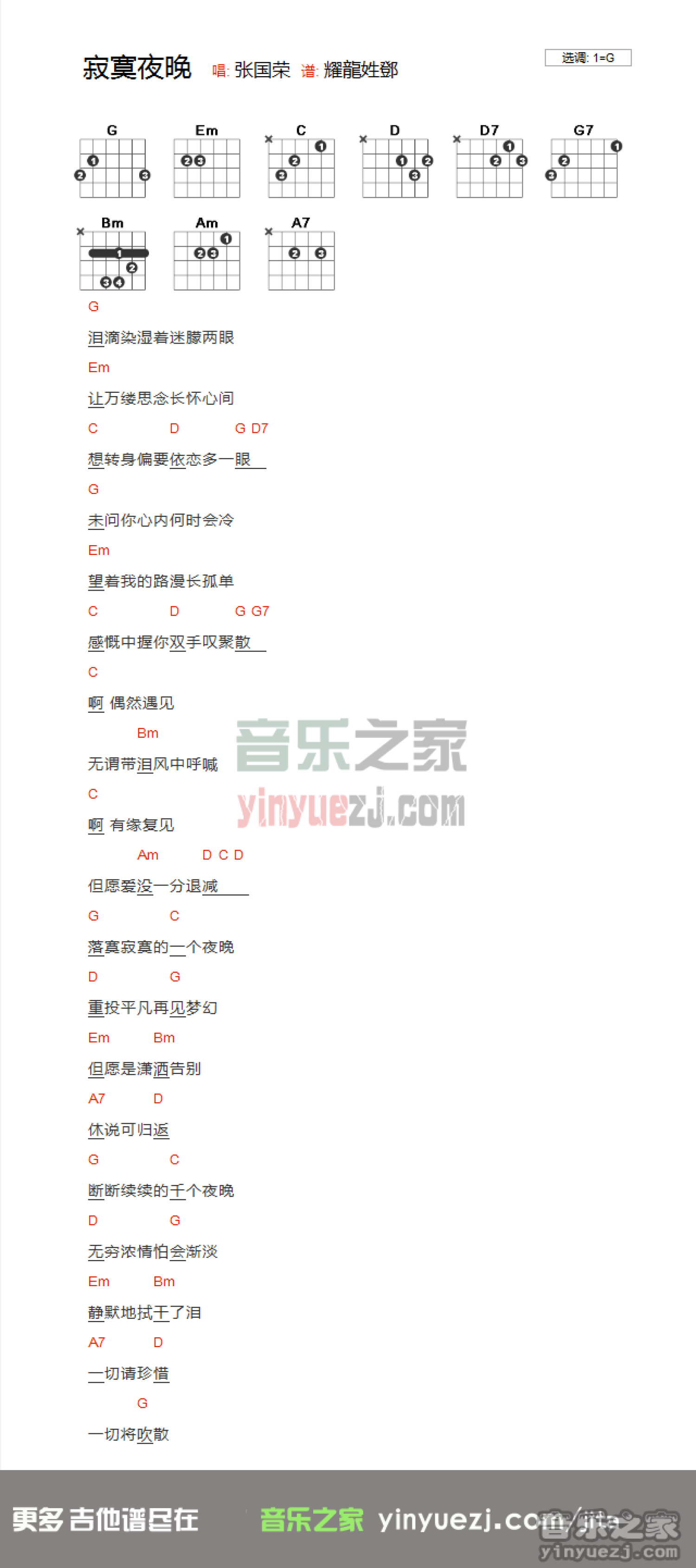 曲谱介绍: G调版张国荣《寂寞夜晚》吉他和弦弹唱谱