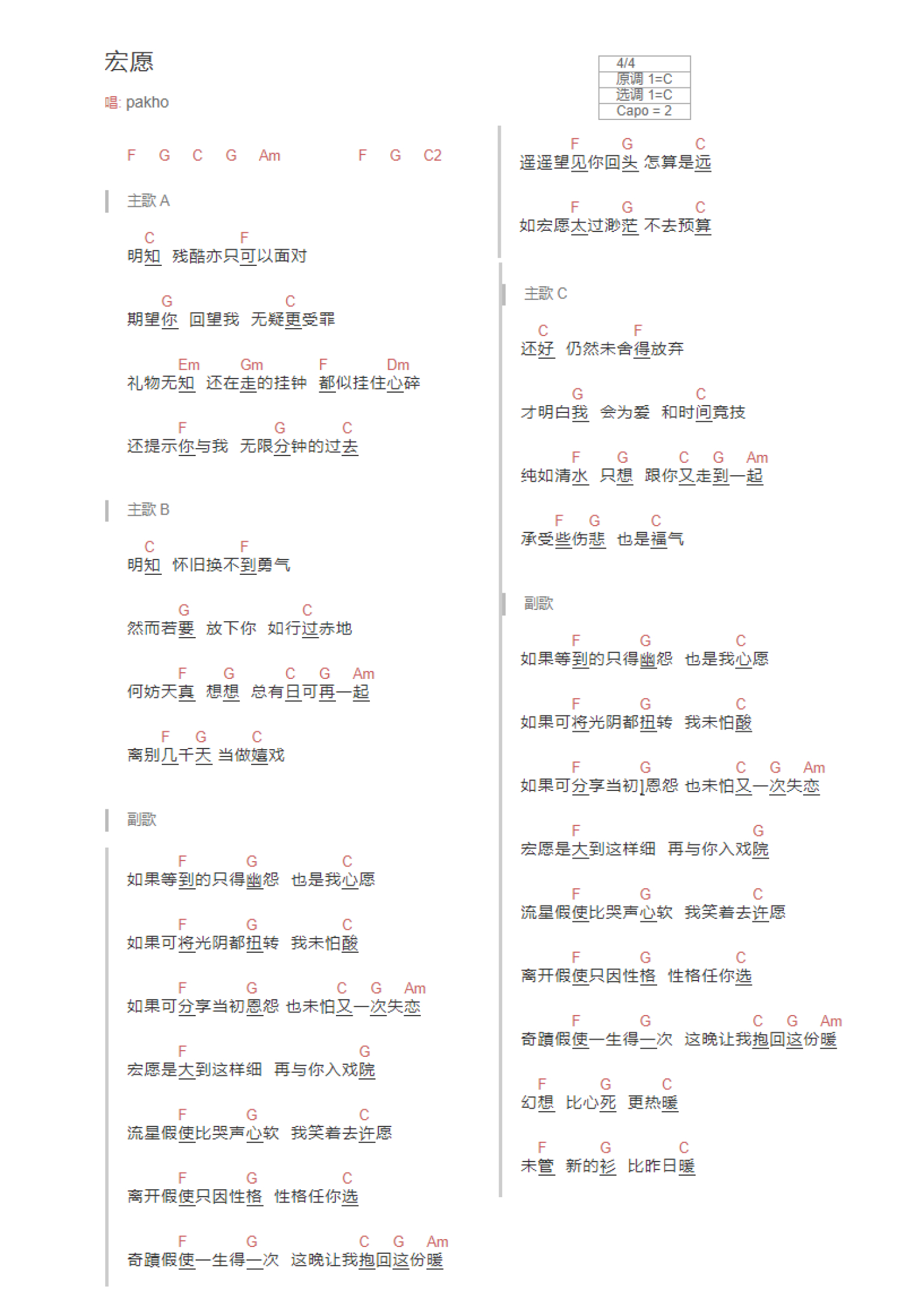 曲谱介绍: C调版周柏豪《宏愿》吉他和弦弹唱谱