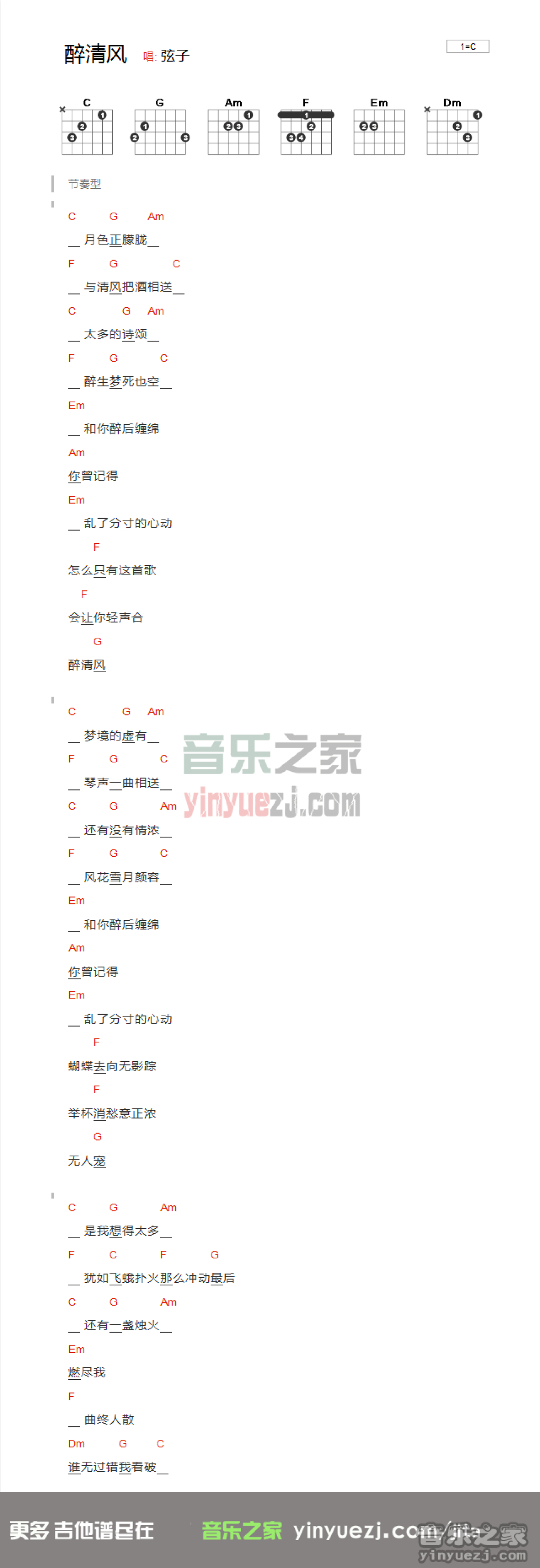 曲谱介绍: C调版弦子《醉清风》吉他和弦弹唱谱