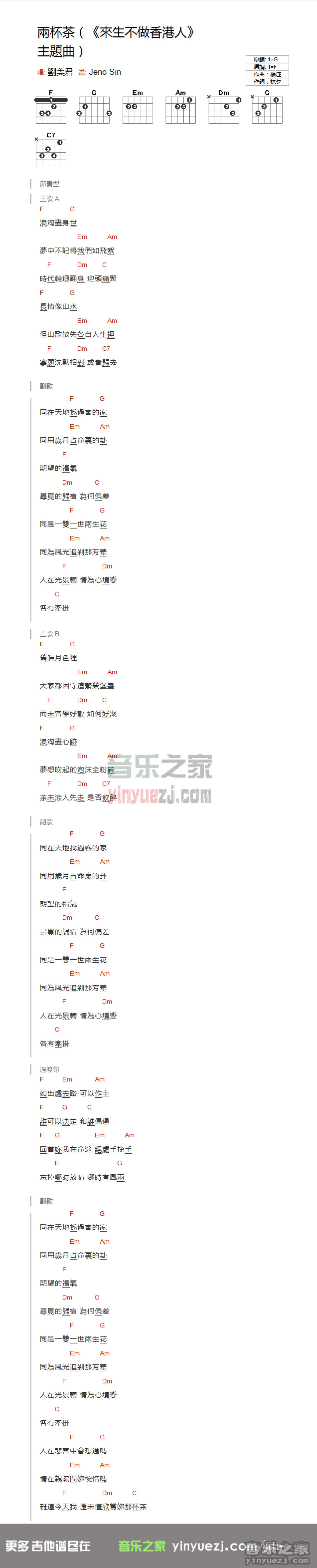 曲谱介绍: F调版刘美君《两杯茶》吉他和弦弹唱谱