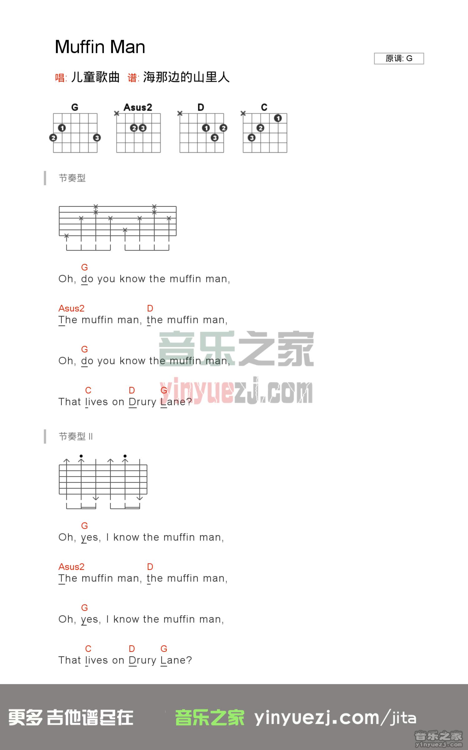 曲谱介绍: G调版 儿歌《muffin man》吉他和弦弹唱谱