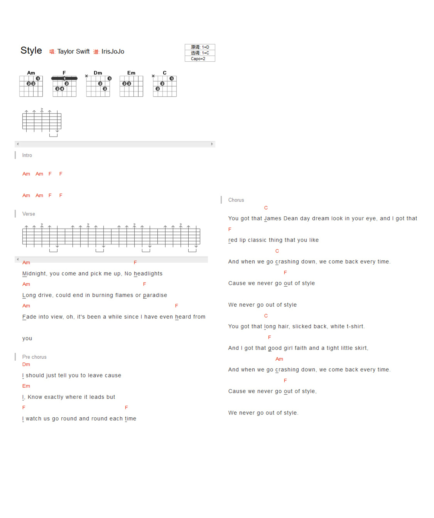 曲谱介绍: C调版 taylor swift《style》吉他和弦弹唱谱
