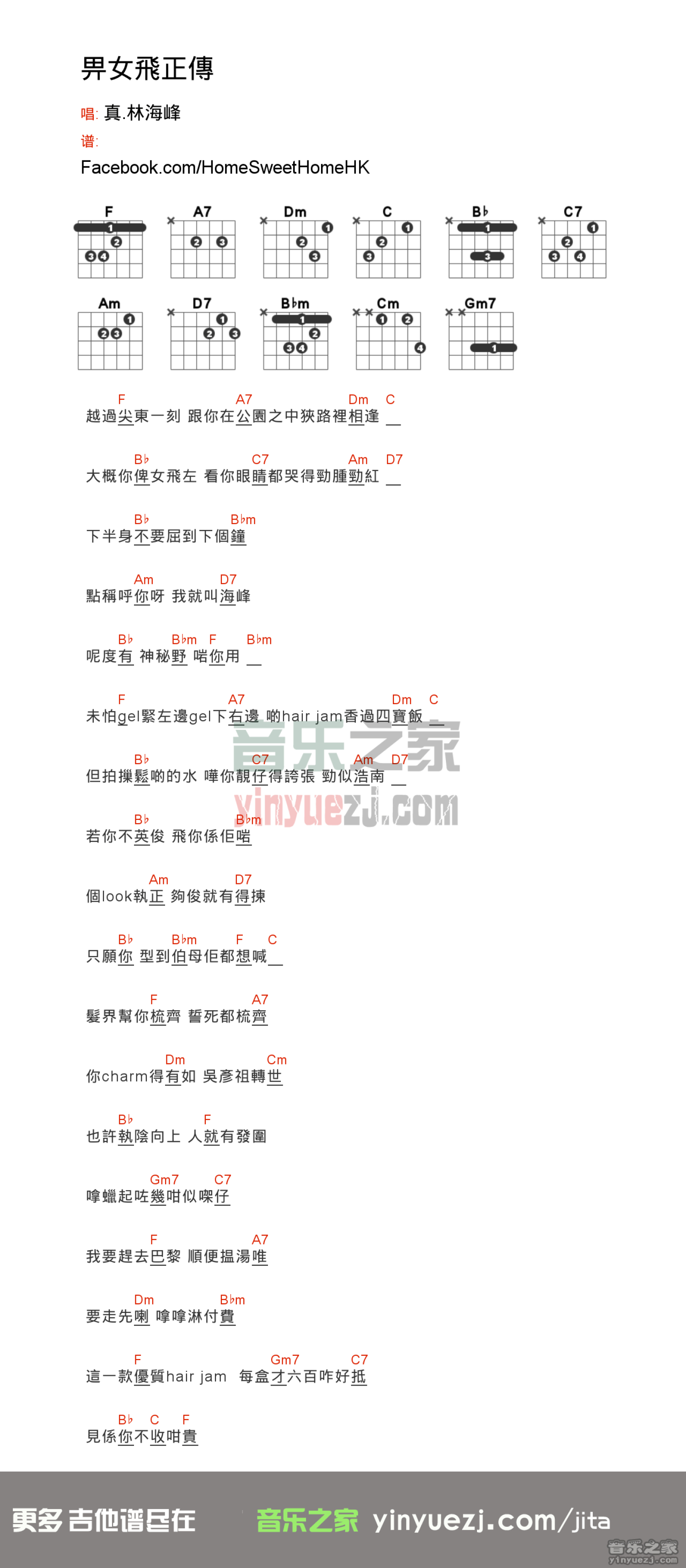曲谱介绍: 林海峰《畀女飞正传》吉他和弦弹唱谱